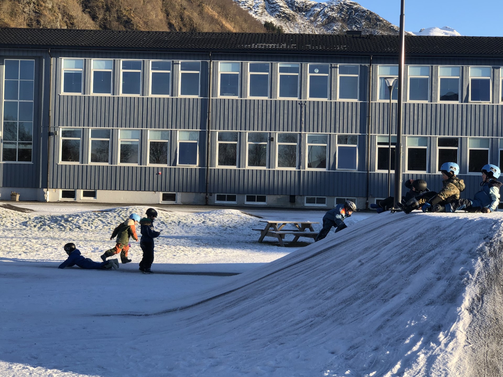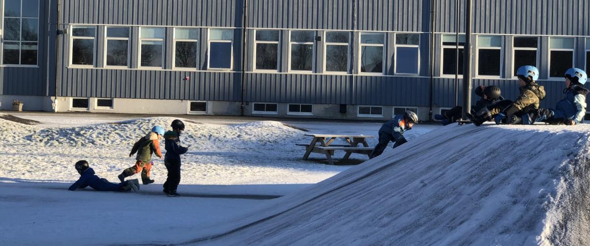 Aktivitetsparken tilbyr et variert aktivitetstilbud - på bildet ser man baksiden av skolen, som ble bygget i fase 1 av prosjektet. Foto: Meløy Kommune