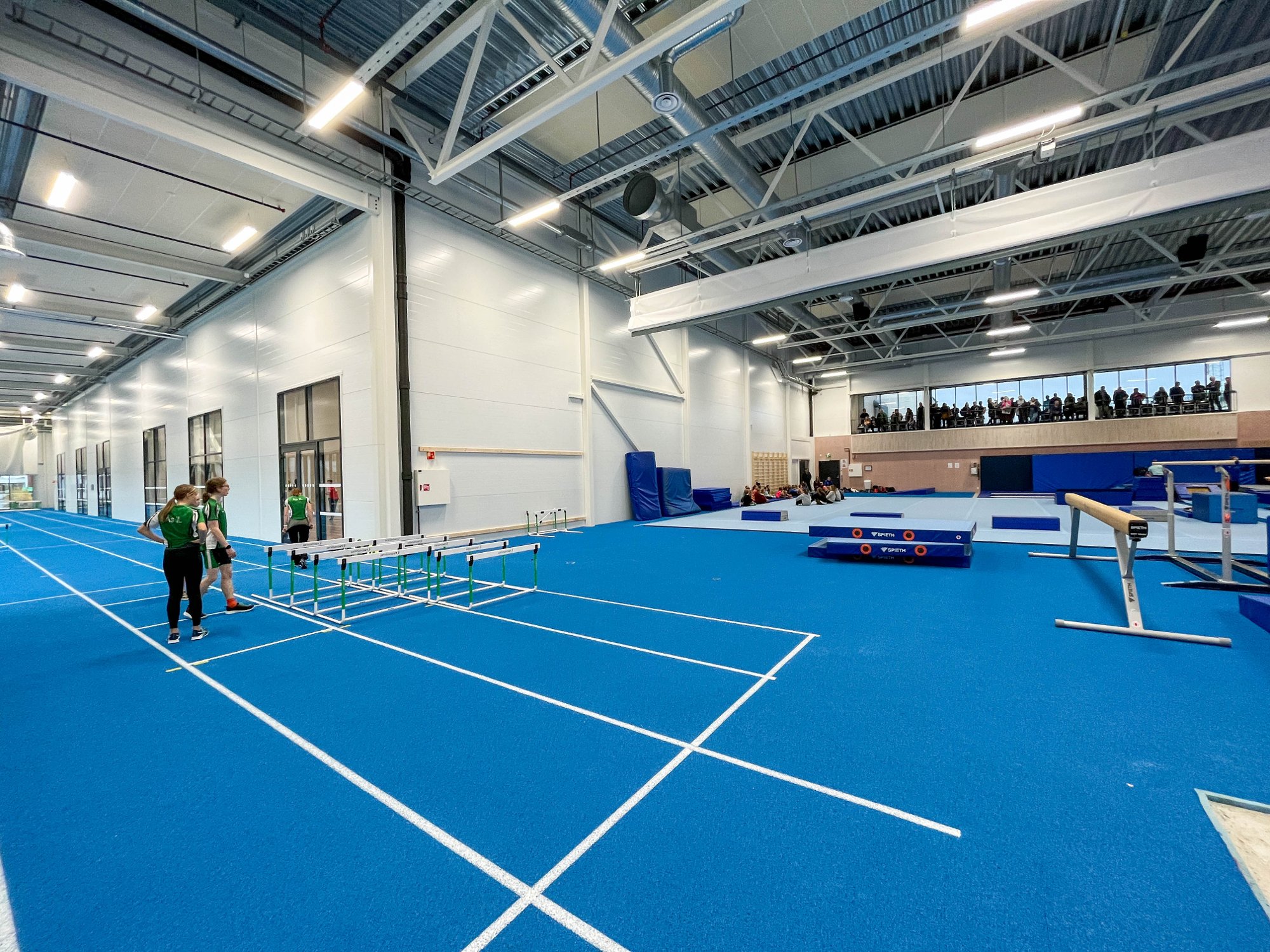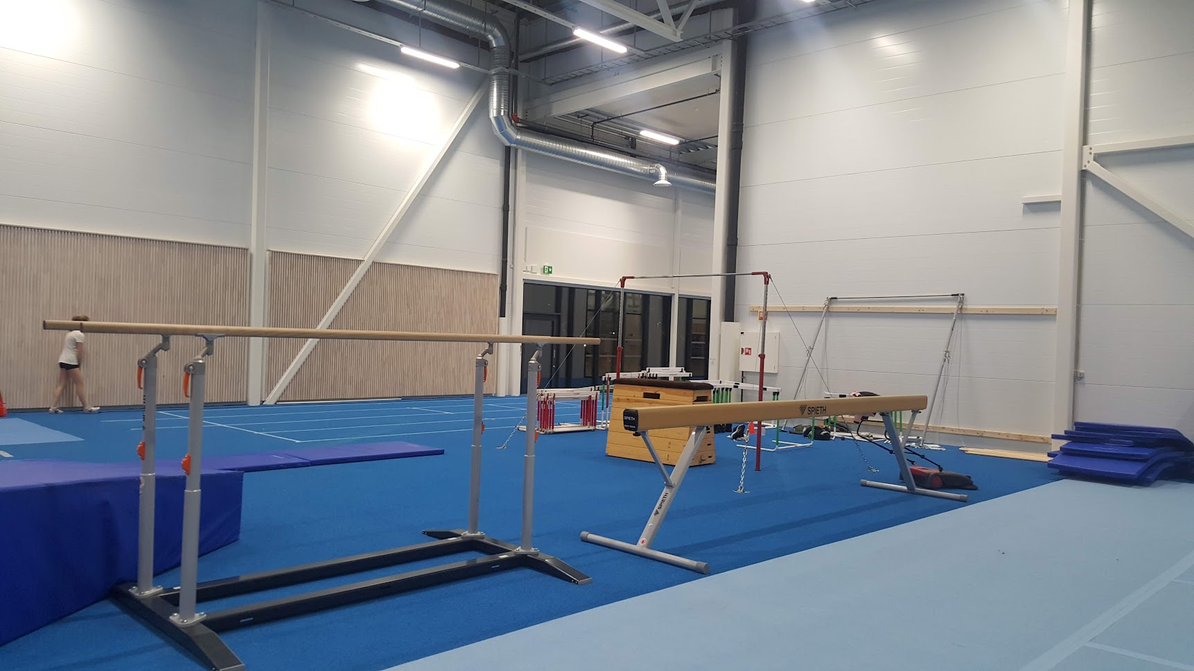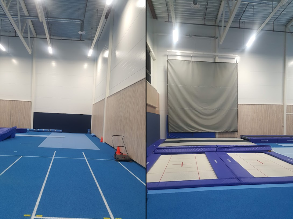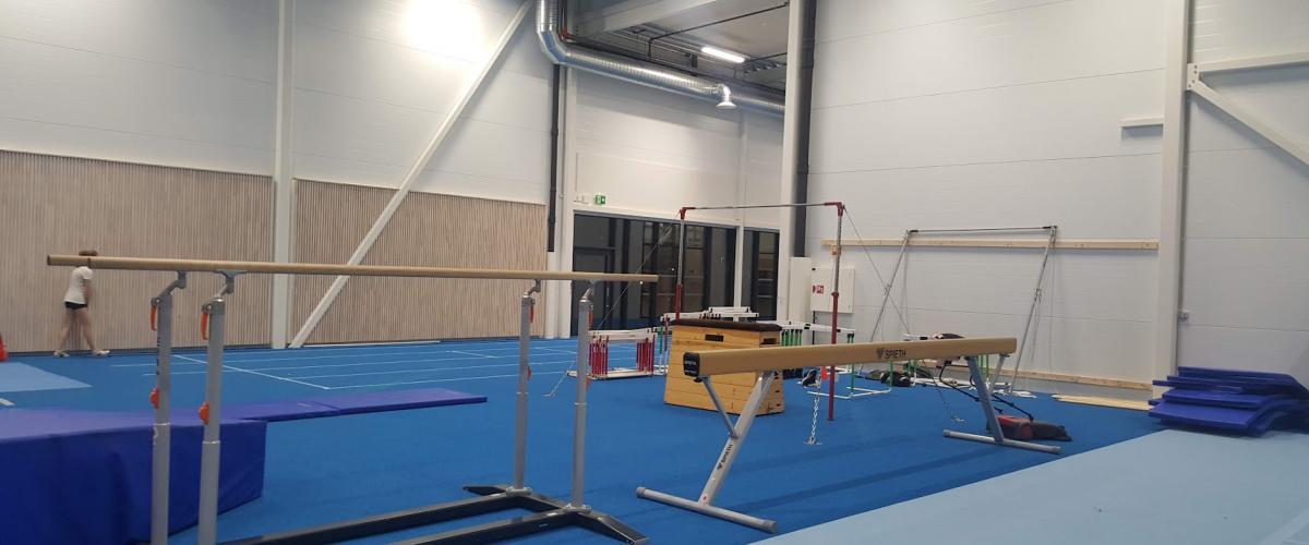 Turnhallen er spesielt tilrettelagt for troppsgymnastikk, med to innebygde trampoliner og softskillmatter (hev- og senkematte) på totalt 66 m², samt store flate til tumbling, trampett og frittstående. Eldre utøvere låner areal i friidrettssonen for å få nok tilløp til trampett og tumbling.