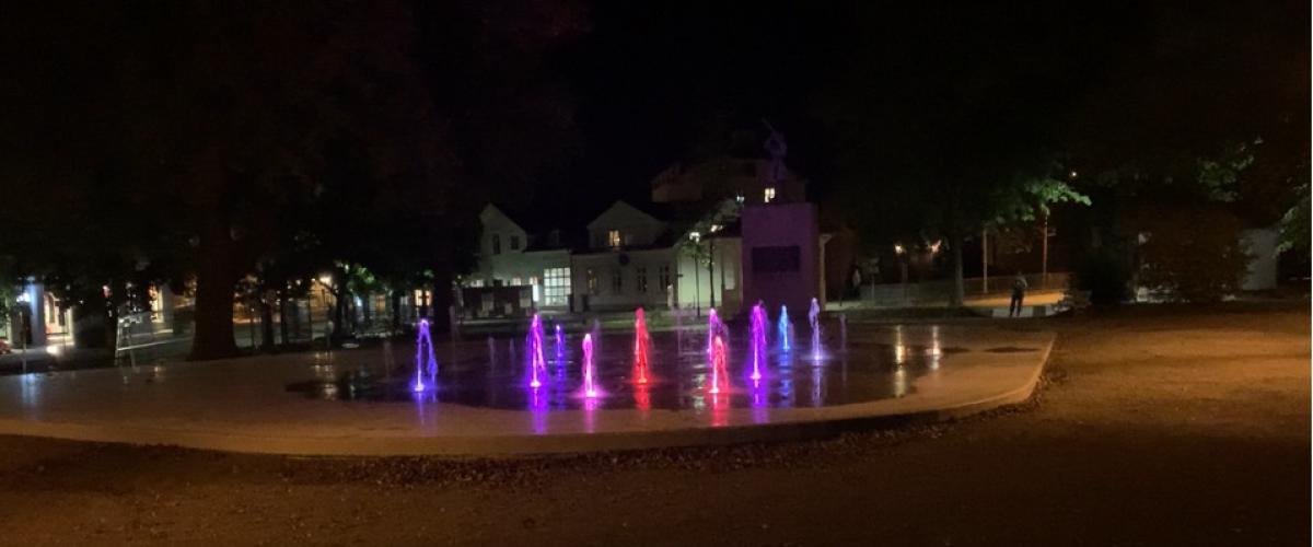 Om sommeren er det vannspill i betongplaten. Det er montert fontene-dyser hvor vannstrålene kan reguleres individuelt, og programmeres til å bytte farger og høyder. De kan også kobles til musikk, slik at vannstrålene "danser" i tråd med musikken. Om kvelden er det et flott skue med fargene i vannet.