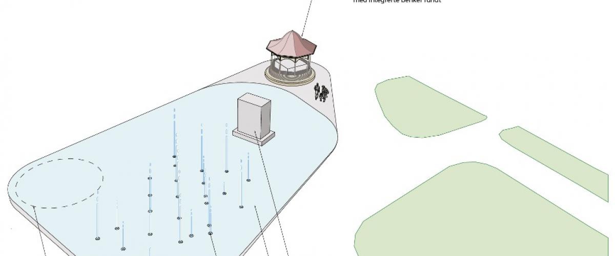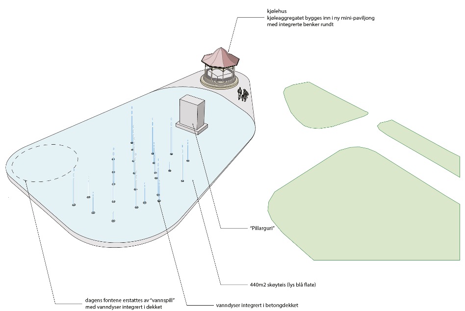 Det er støpt ei betongplate på 440 kvadratmeter, hvor det er lagt ned kjøleslynger for å lage skøyteis på vinteren, det er lagd dyser til vannfontener som er i bruk når det ikke er skøyteis. Det er også laget plass til to bowlsbaner på samme areal.