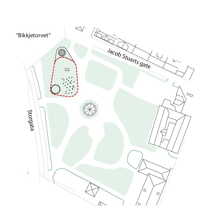 Statuen deler området i to om sommeren, med vannspillet på den ene siden og bowlsbanene på den andre siden. Bowlsbanene er laget av kunstgress, omtrent likt det som brukes på golfbaner. Gi og med at de skal tas bort om vinteren er det montert med en spesialtape.