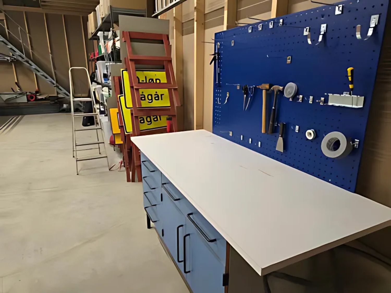 - Romslig lager for oppbevaring av arrangementsutstyr, og som også brukes som verksted
