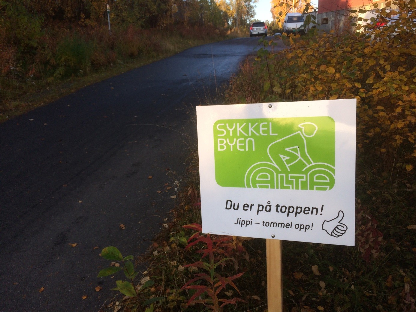 Sykkelbyen Alta er et samarbeidsprosjekt mellom Alta kommune, Statens vegvesen og Finnmark fylkeskommune, med visjon om å få flest mulig til å bruke sykkel; hele året. I et møte mellom Alta kommune og Ungdomsrådet, kom det en ide om å motivere syklende ved å ha en "high-five"-maskin på toppen av bakke, som belønner deg når du kommet deg helt opp. Dette motivasjonstiltaket ble dog for komplisert og dyrt, men istedet laget man enkle motivasjonskilt.