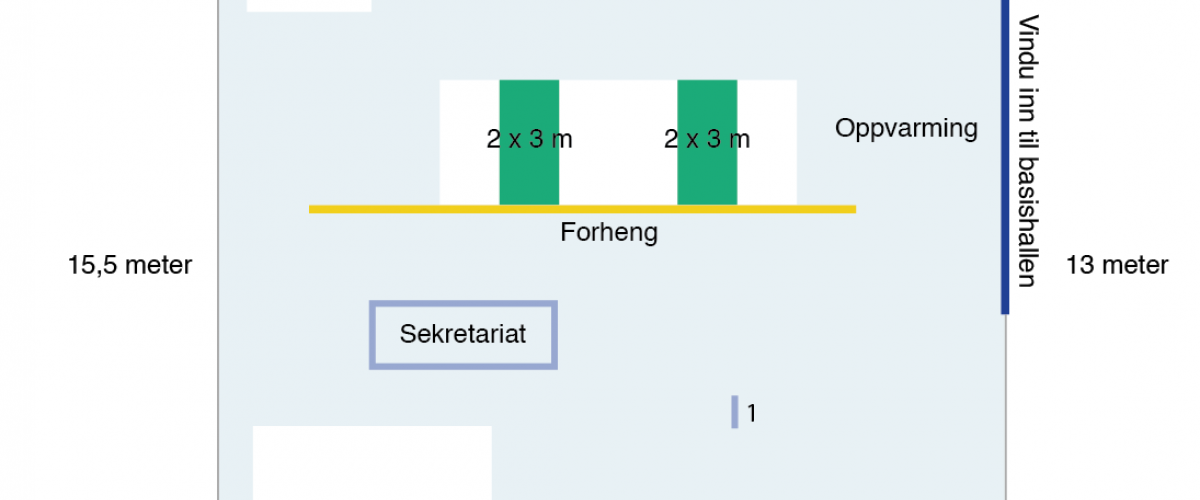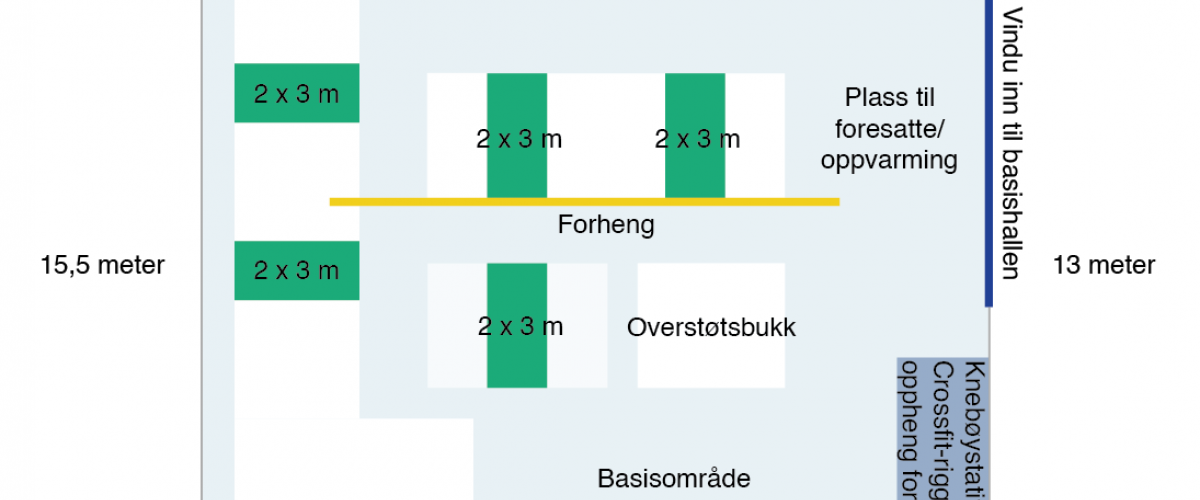To skisser over styrkerommet ved trening og daglig bruk samt ved mindre stevner (ved større stevner benytter man flerbrukshallen) finnes i bildekarusellen.