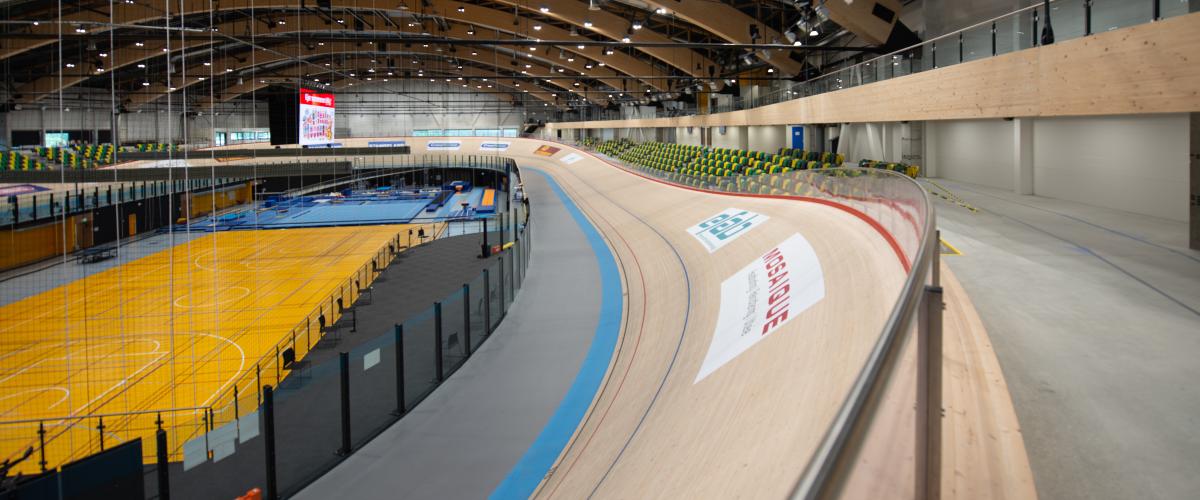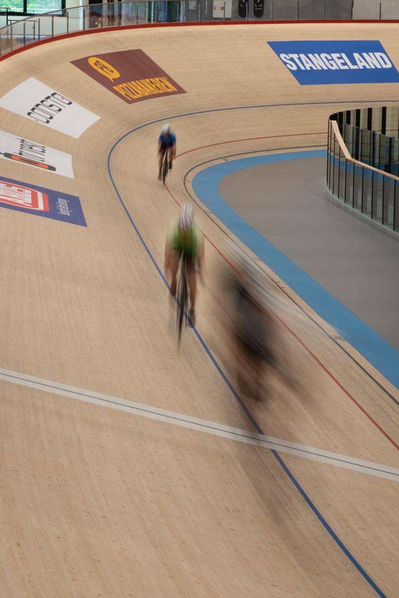 Anlegget er konstruert med betongdekker og store limtredragere som muliggjør søylefrie siktlinjer, i tråd med UCI-kravene. Limtredragerne, produsert i Tyskland, har et spenn på opptil 80 meter og måtte fraktes med spesialtransport og monteres med kraner.