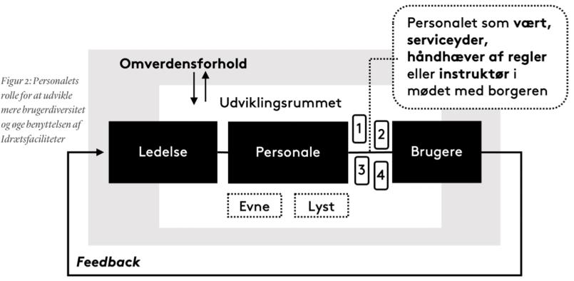 Utviklingsrommet i modellen er en abstraksjon hvor det foregår løpende dialoger og forhandlinger mellom ledelsen og anleggets ansatte om hvordan anlegget skal utvikles - i dette tilfellet med særlig fokus på å øke bruken og brukermangfoldet. I hverdagen spiller de ansatte en sentral rolle i anlegget ettersom de er i tett samspill med brukerne. Studien viser at de ansatte derfor har en viktig rolle utviklingsrommet.