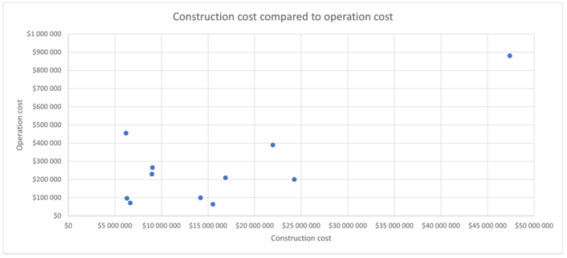 Vi har sett på forholdet mellom byggekostnad og drifts- og vedlikeholdskostnad i et livssyklusperspektiv. Levetiden til anleggene ble definert til 50 år. Ved å benytte kalkulasjonsrente på 4 % får vi at forholdet mellom drifts- og vedlikeholdskostnader og byggekostnader (dvs. drifts- og vedlikeholdskostnader dividert med byggekostnader) over anleggets levetid varierer mellom 0,1 og 1,6, med gjennomsnitt på 0,4.
