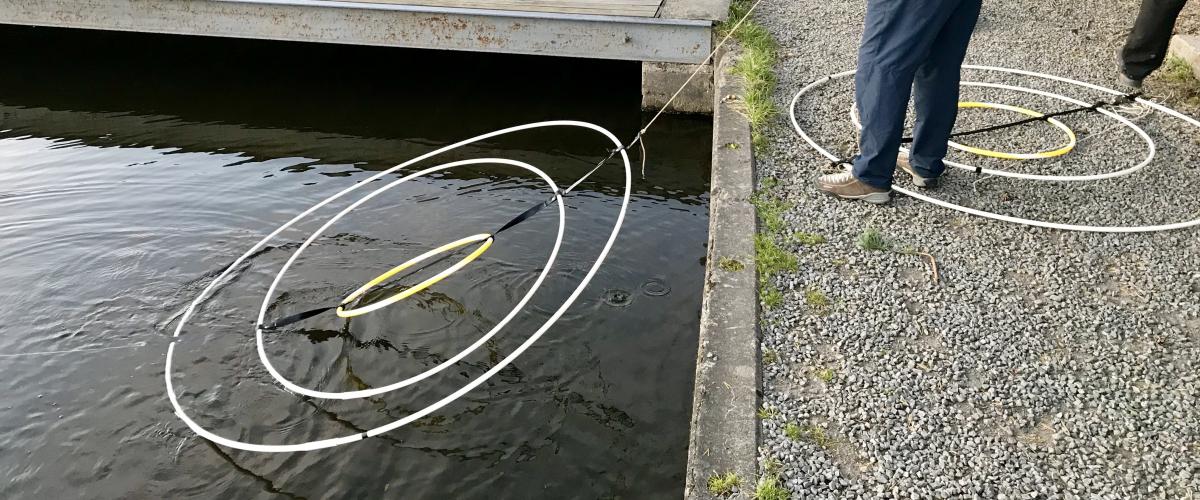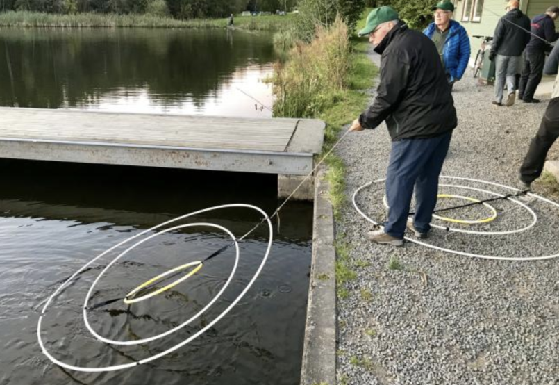 Geir Granli, leder av Oslo Sportsfiskere forteller at de bruker tynne flettede nylontau for å posisjonere ringene på vannet, se bildet under fra Holmendammen.