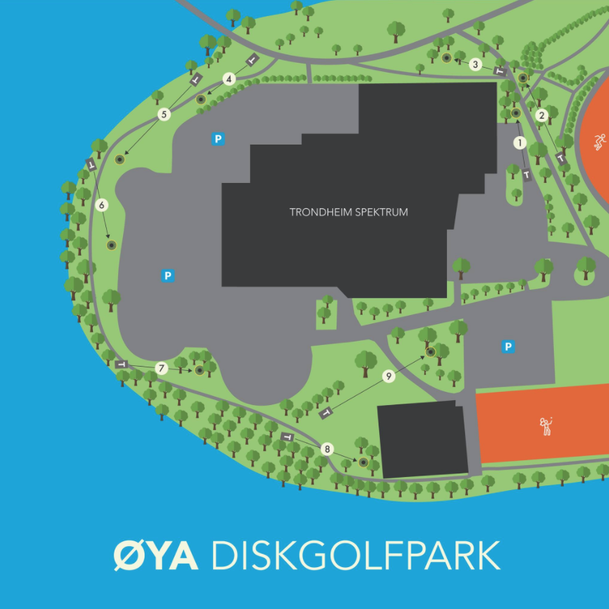 Diskgolfkurver, utkastfelt, teesign, scorekort papir eller digitalt.