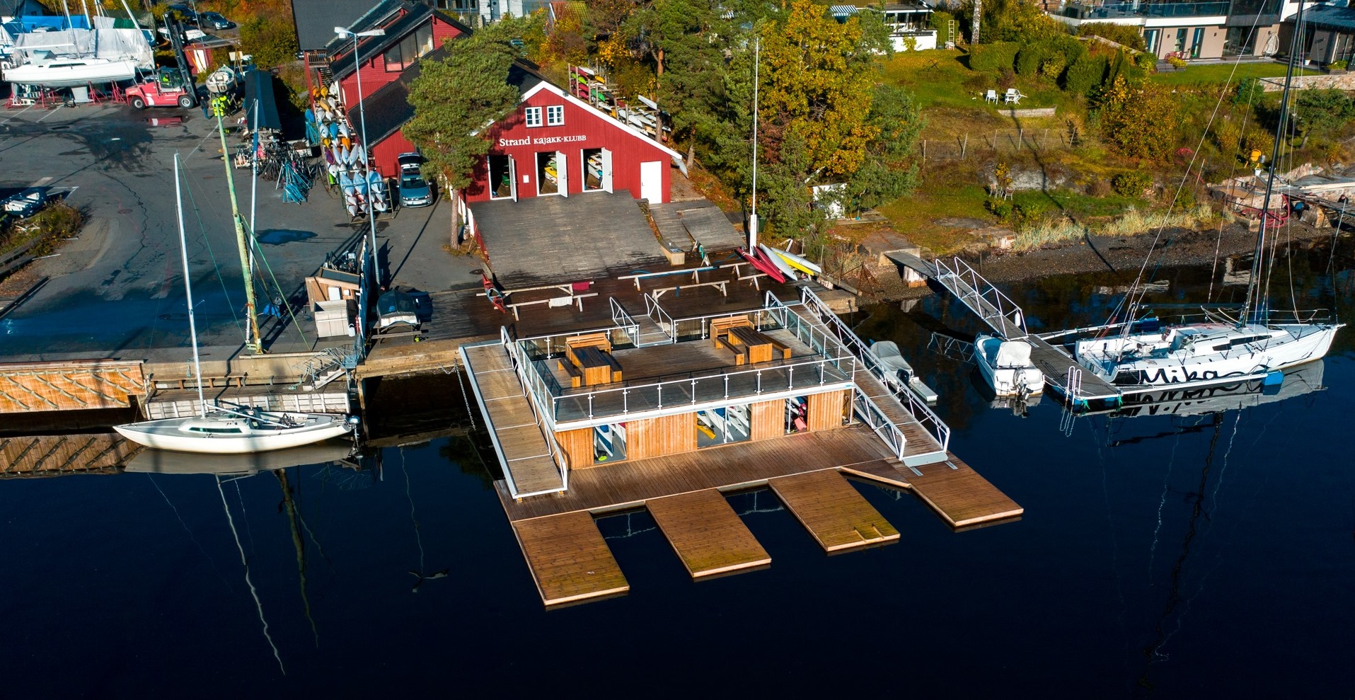 Til tross en liten tomt, har Strand Kajakklubb utnyttet det fulle potensialet, og kan skilte med en stor båthall, treningsrom, en stor brygge, sosiale rom, kontorer og garderober. Alt dette har de fått plass til i det røde huset vi kan se på bildet nedenfor.
