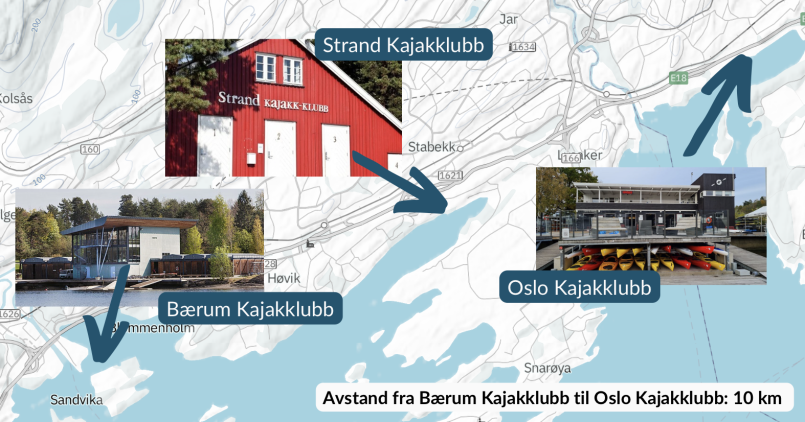 Vi skal presentere anleggene hver for seg, men under visualiseres den korte avstanden det er mellom anlegget, der det er ti kilometer fra Bærum Kajakklubb sitt anlegg på Kalvøya, og Oslo Kajakklubb sitt anlegg i Bestumkilen.