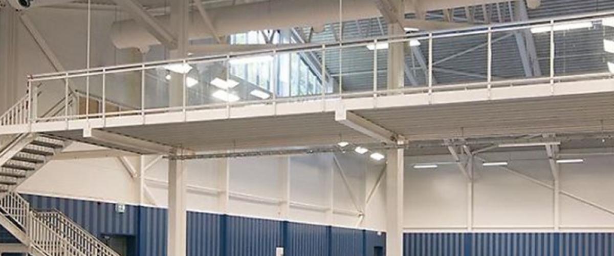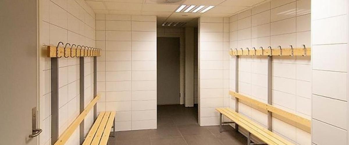 I servicedelen er det flis på gulvet i første etasje og sportsparkett (heltre eik på en cm fjærende pute) i andre etasje. Veggene består av gips og malt betong. Det meste av servicedelen har systemhimlinger.