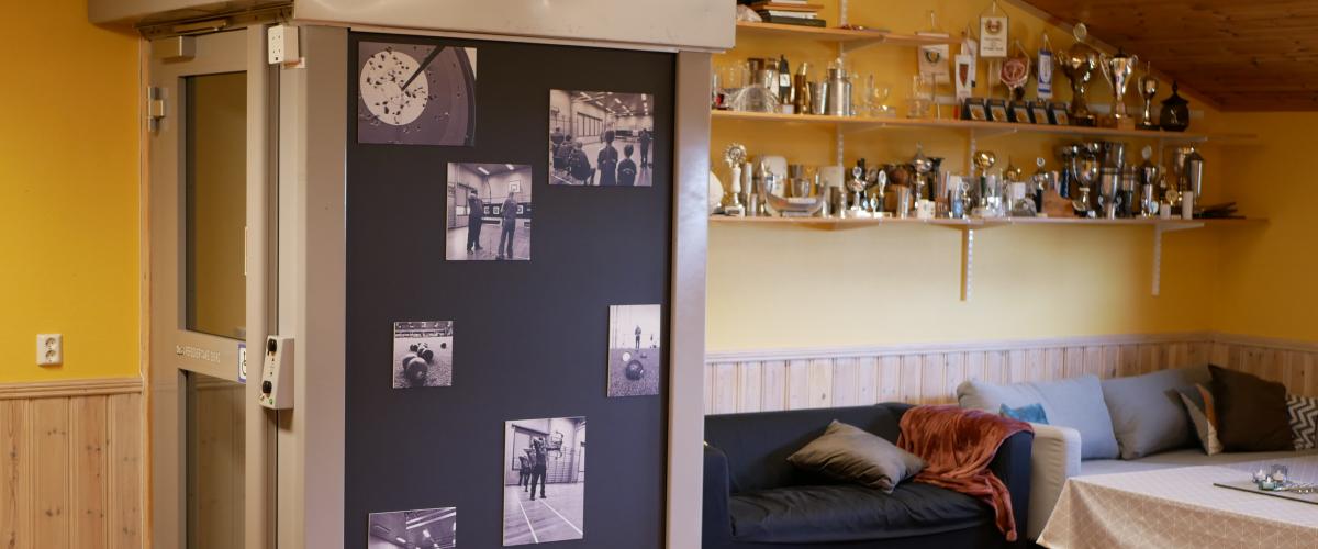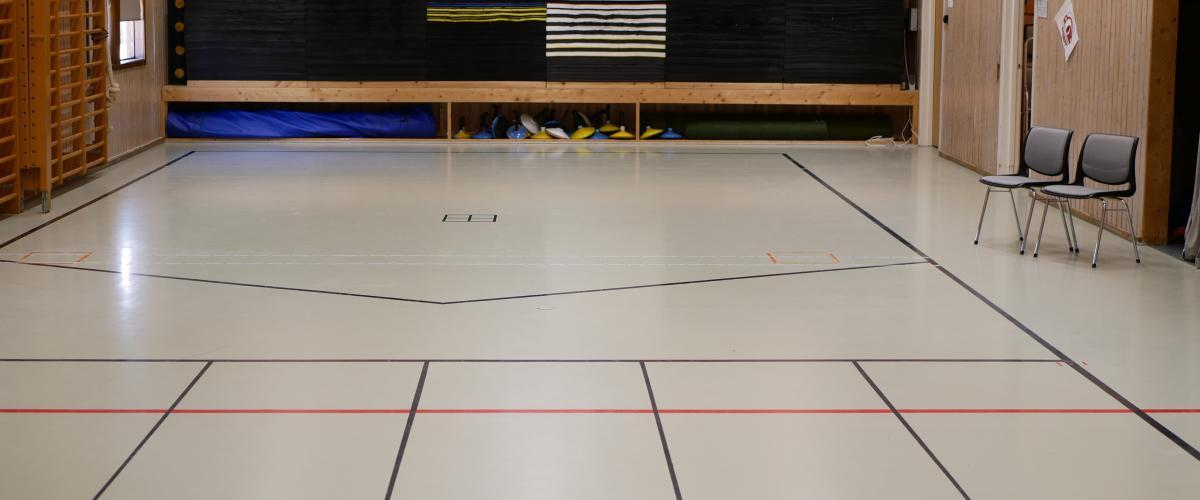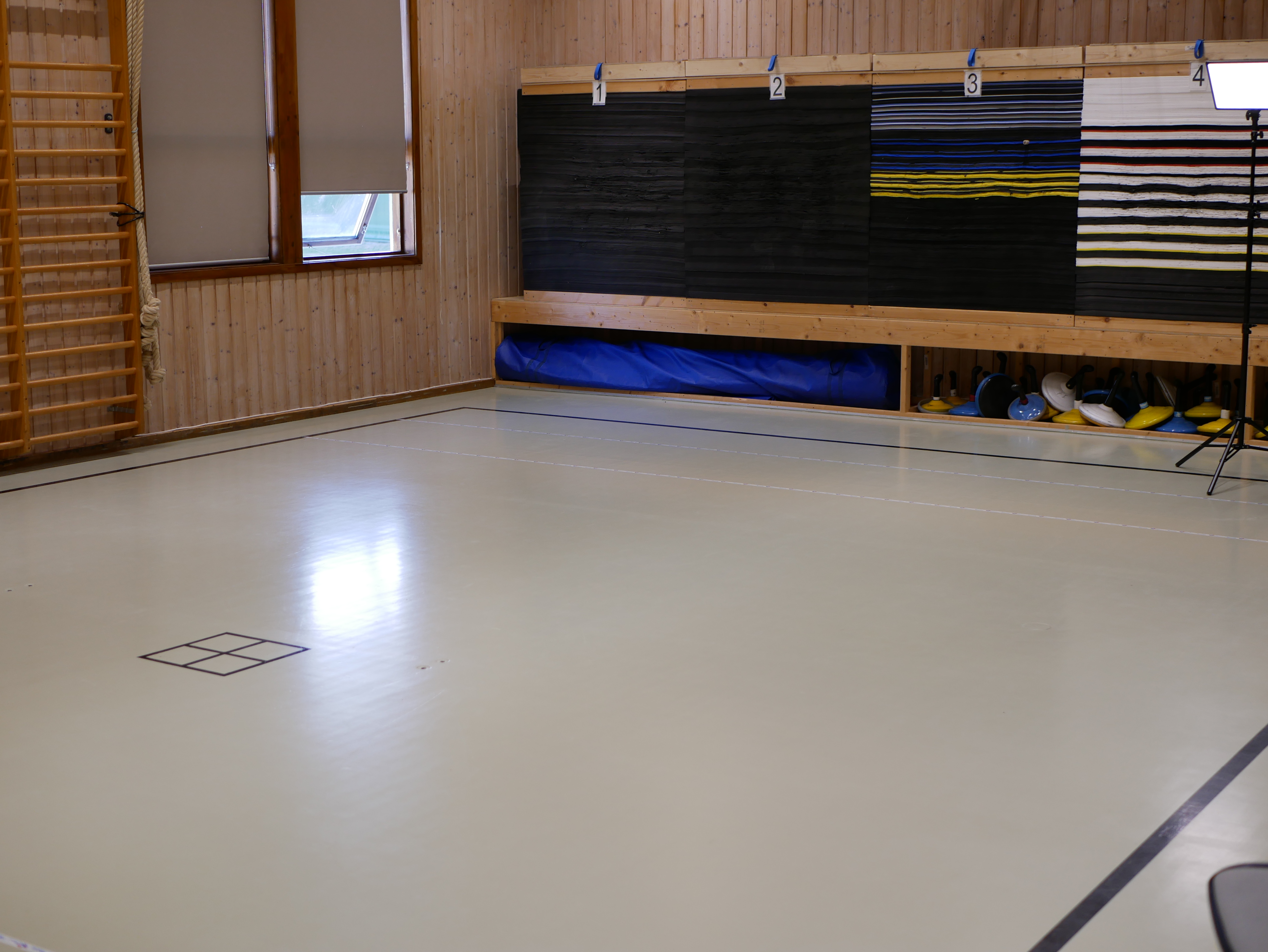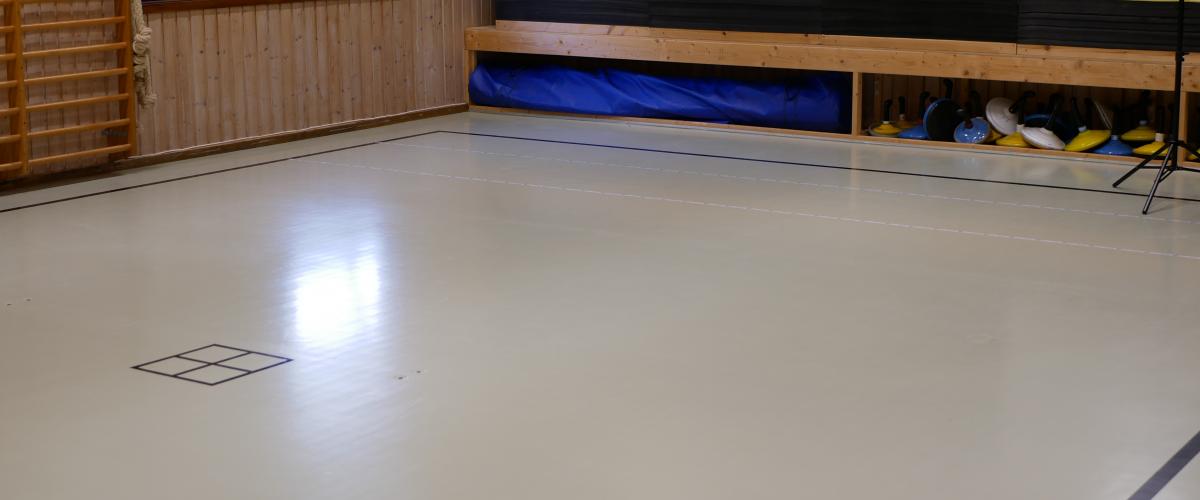 Gymsalen er også brukt for bueskyting og har utstyr for teppecurling.