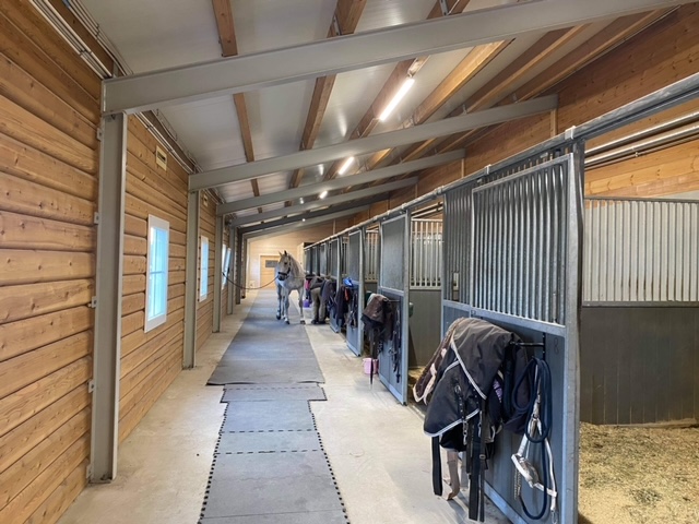 I stallen er det ni stallbokser, hvorav den ene er isolatboks. Her finner man også salrom og stort tørkerom med plass til lagring av utstyr. Det er også dobbelt vaskespilt, fôrrom og teknisk rom.