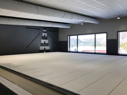 - Hev- og senkbar bunn i bassenget av stål. Denne heves over vannspeilet når bassenget ikke er i bruk for å hindre avdamping, noe som reduserer behovet for oppvarming og avfukting.