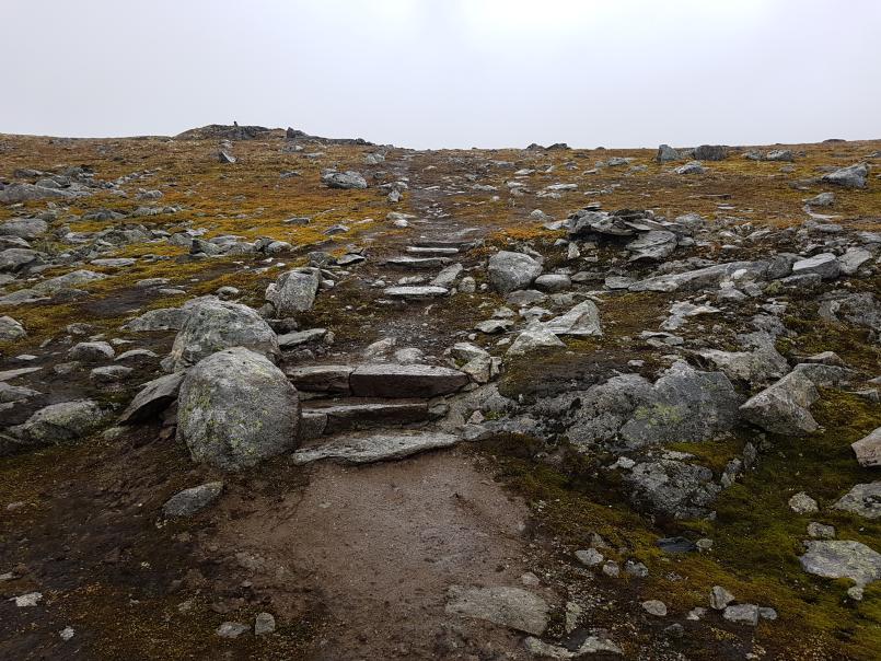 - Stedegen materialbruk: Stien er bygd av kortreist grus og stein fra stedet, og er tilpasset terrenget på mest mulig nennsom måte for å hindre sår i landskapet. Humusdekket er tatt vare på og gjenbrukt. Materialet som er brukt, har lang levetid.»
