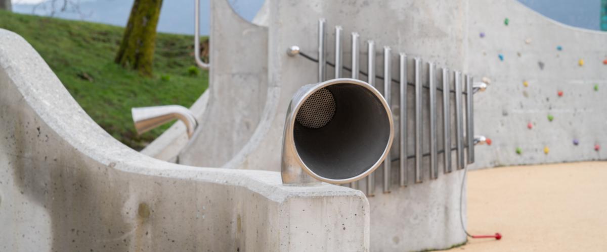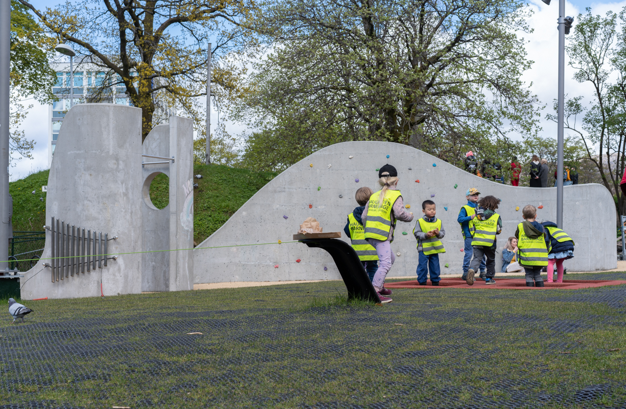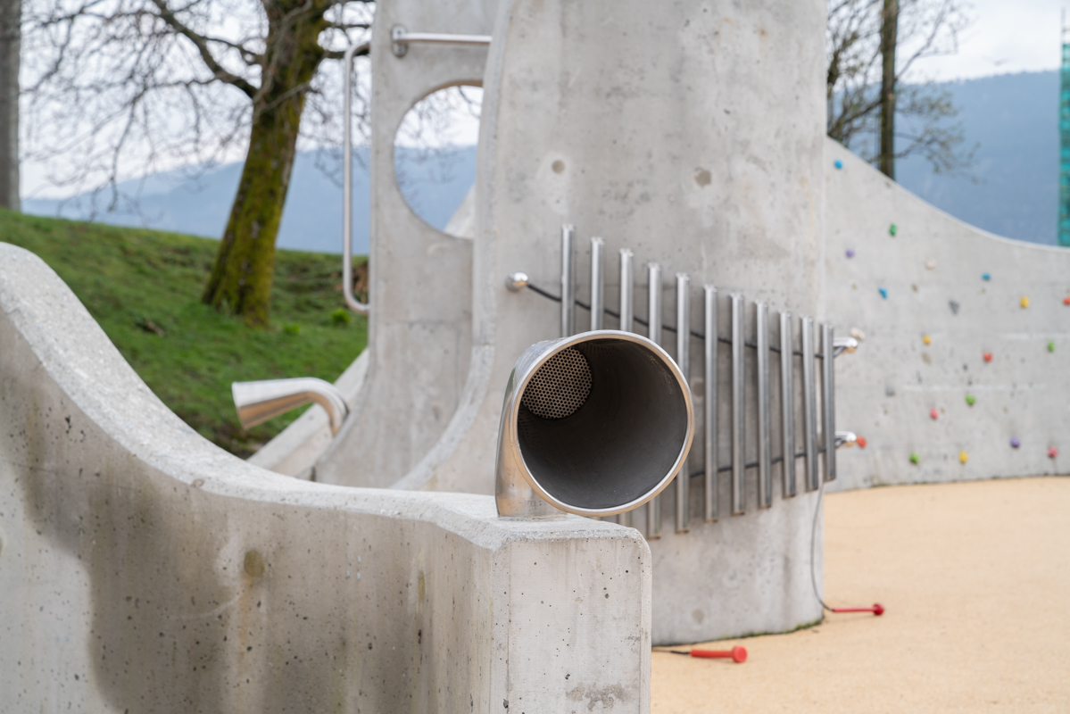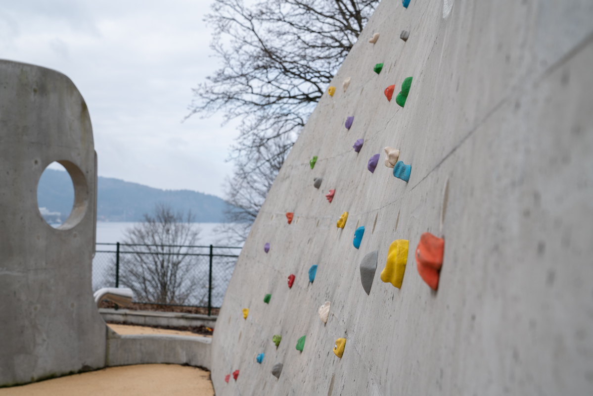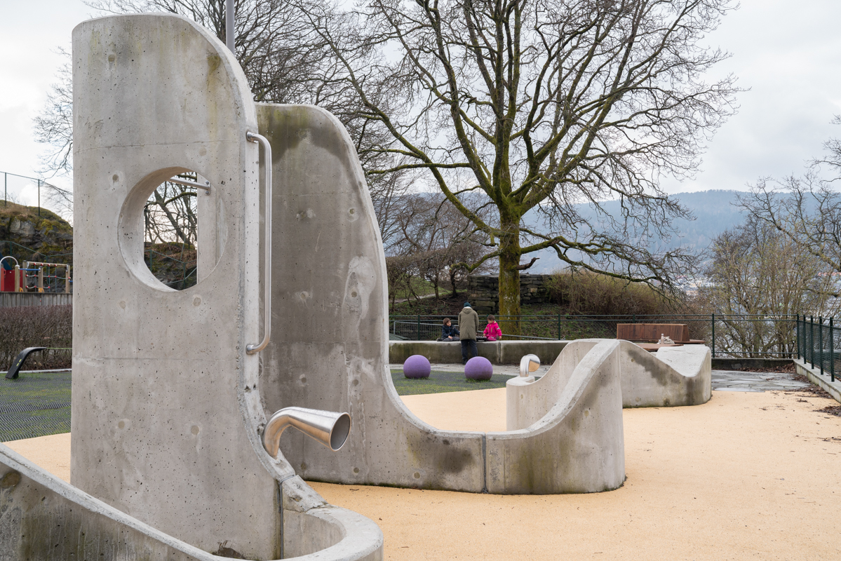 Anlegget er planlagt og utført med et inviterende og skulpturelt utformet klatre- og aktivitetselement i betong. Formmessig er elementet tydelig inspirert av fjorden og bølgeformen, mens den innholdsmessig inneholder en rekke muligheter for både klatring, parkour og lydspill.