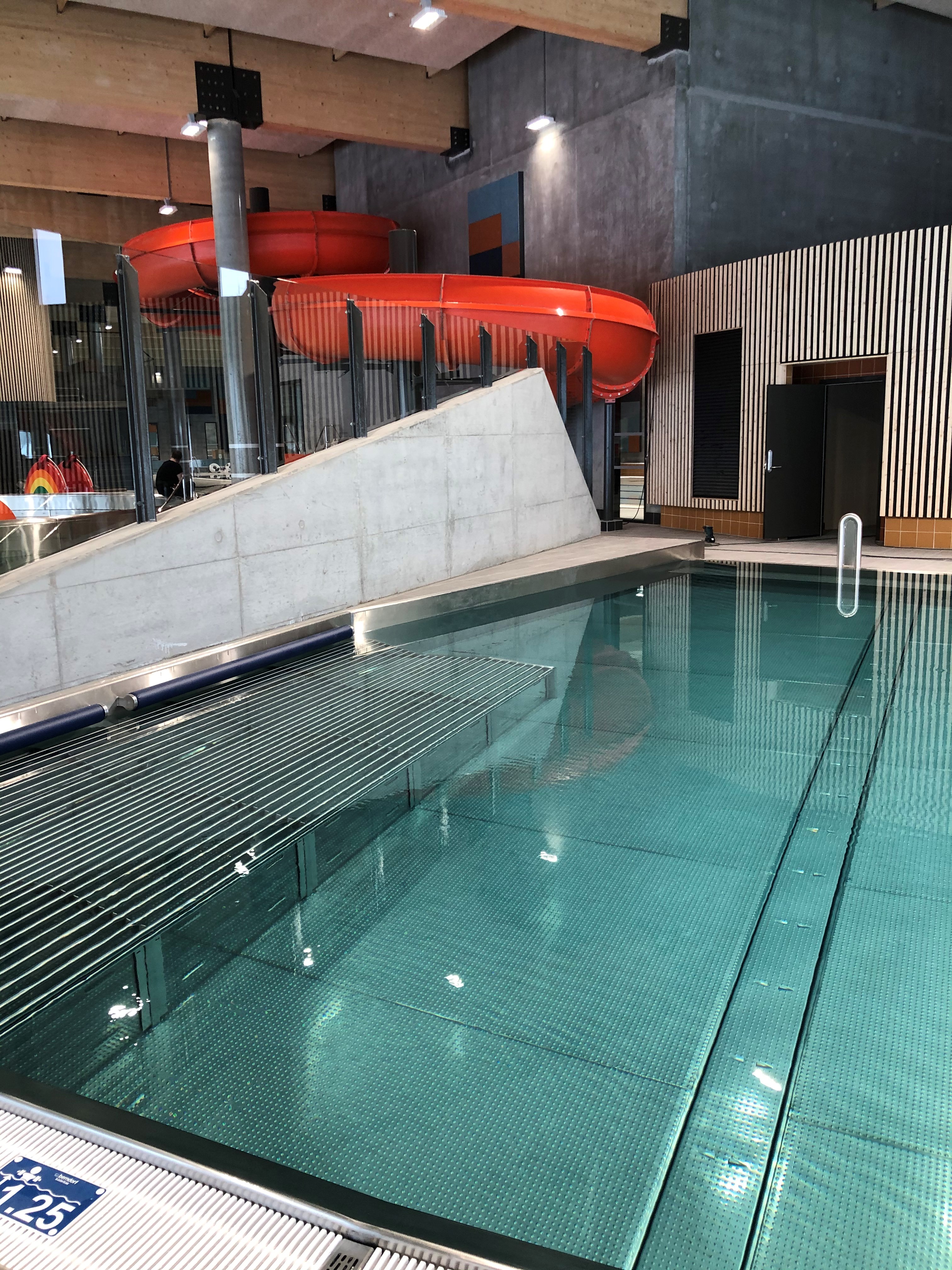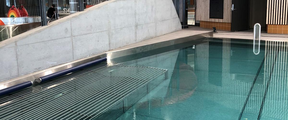 Opplæringsbasseng med heve- og senkebunn. Dybden kan justeres mellom 0 og 1,6 meter, og kan derfor tilpasses brukerne.