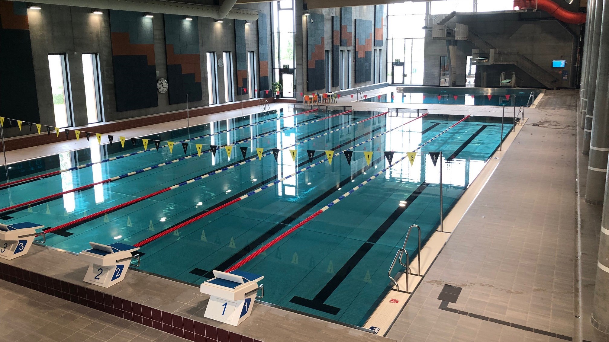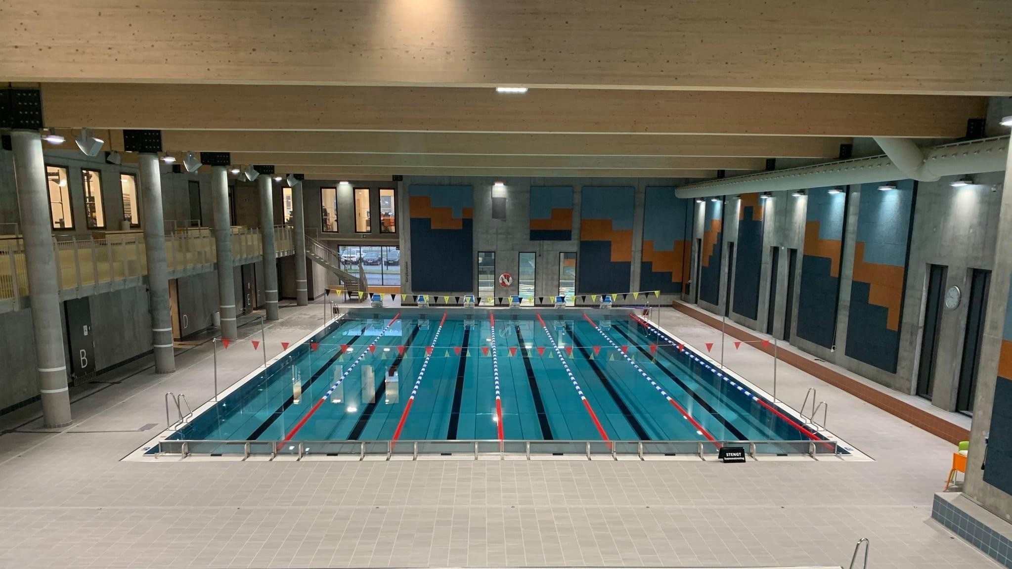 Kortbaneanlegg med 6 konkurransebaner på 2,5 meters bredde. Profesjonelle startpaller. Dybde mellom 1,3 og 1,8 meter.
