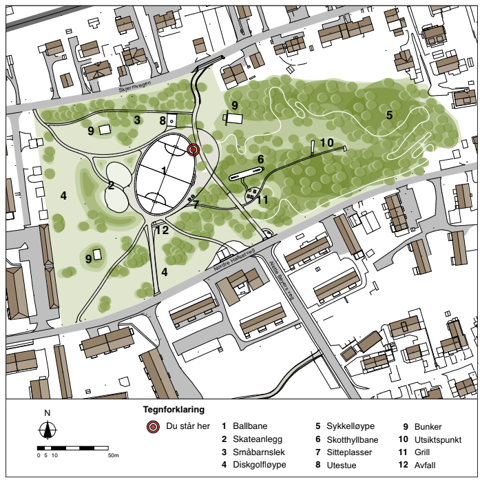 Parken har fått nye stier og en oppgradert snarvei, møteplasser med benker og bord, utestue og grill. I skogen er det et utsiktspunkt.
