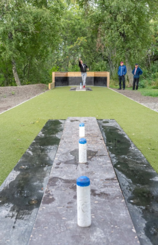 Inntil skogskanten er det laget en skotthyllbane. Skotthyll er en aktivitet der man kaster jernskiver (såkalte hyller) mot trekubber (såkalte munker) som står i den andre enden av banen.