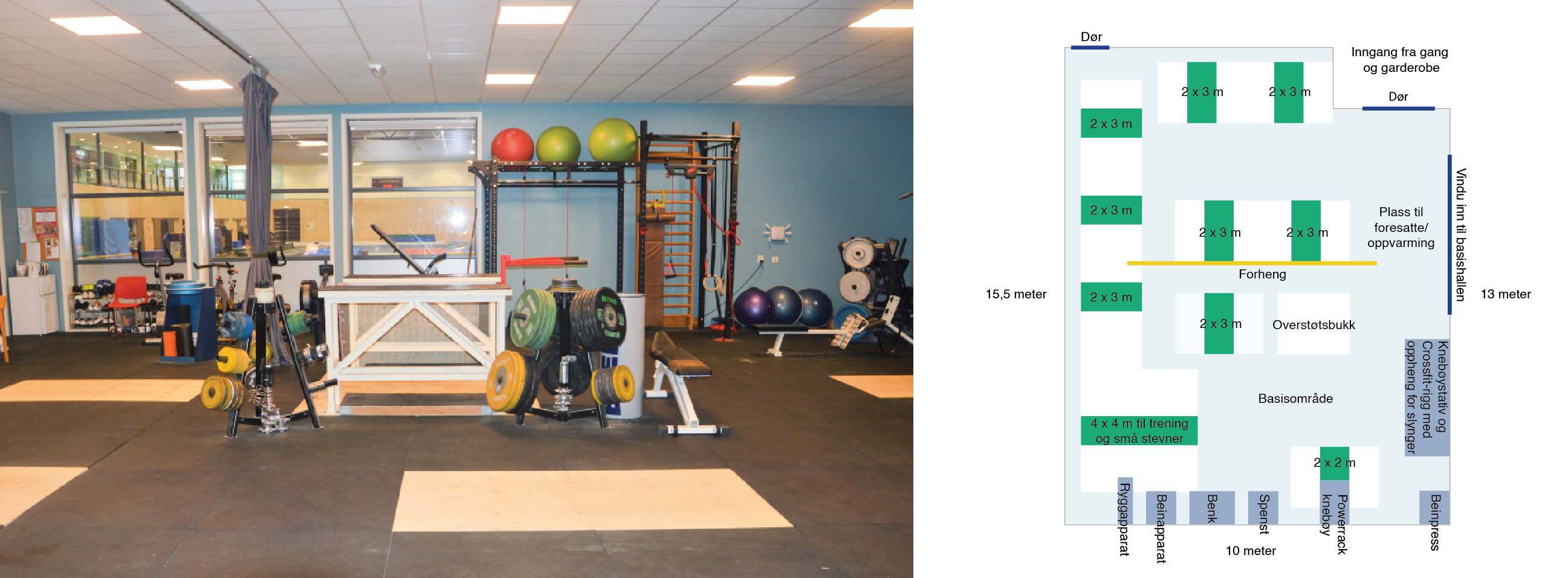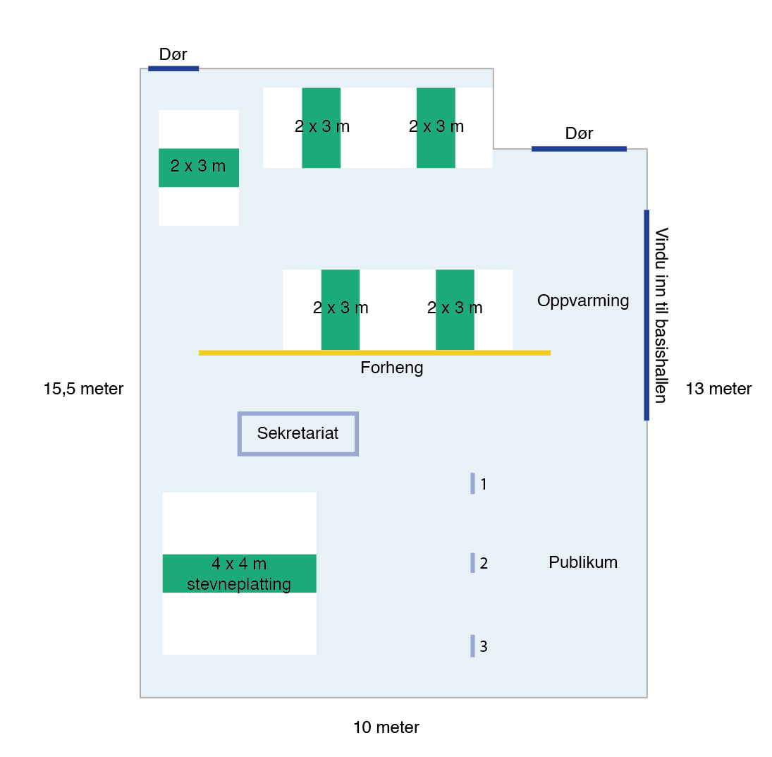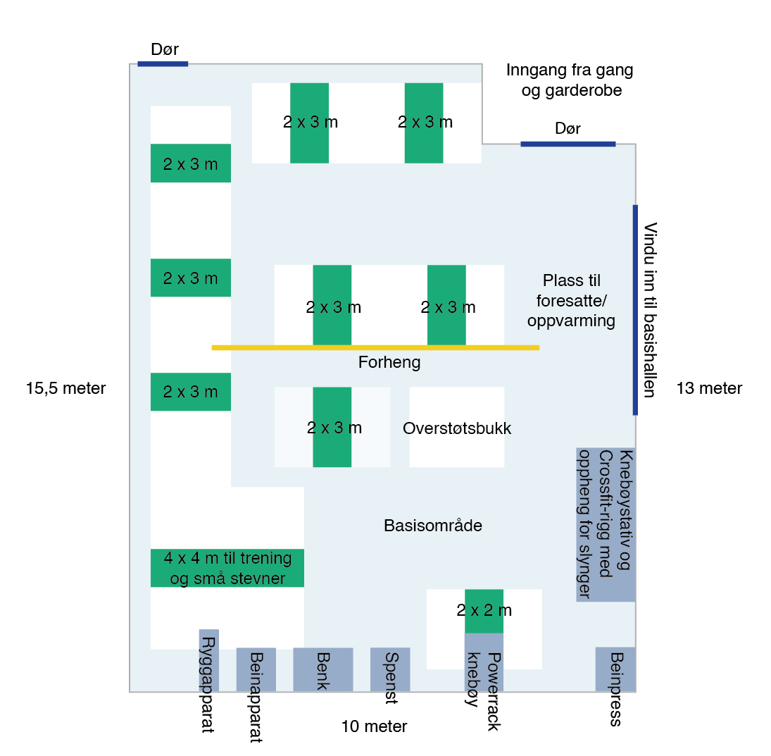 To skisser over styrkerommet ved trening og daglig bruk samt ved mindre stevner (ved større stevner benytter man flerbrukshallen) finnes i bildekarusellen.