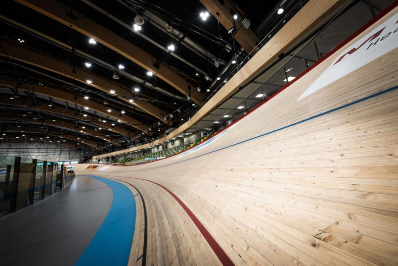 Anlegget er konstruert med betongdekker og store limtredragere som muliggjør søylefrie siktlinjer, i tråd med UCI-kravene. Limtredragerne, produsert i Tyskland, har et spenn på opptil 80 meter og måtte fraktes med spesialtransport og monteres med kraner.