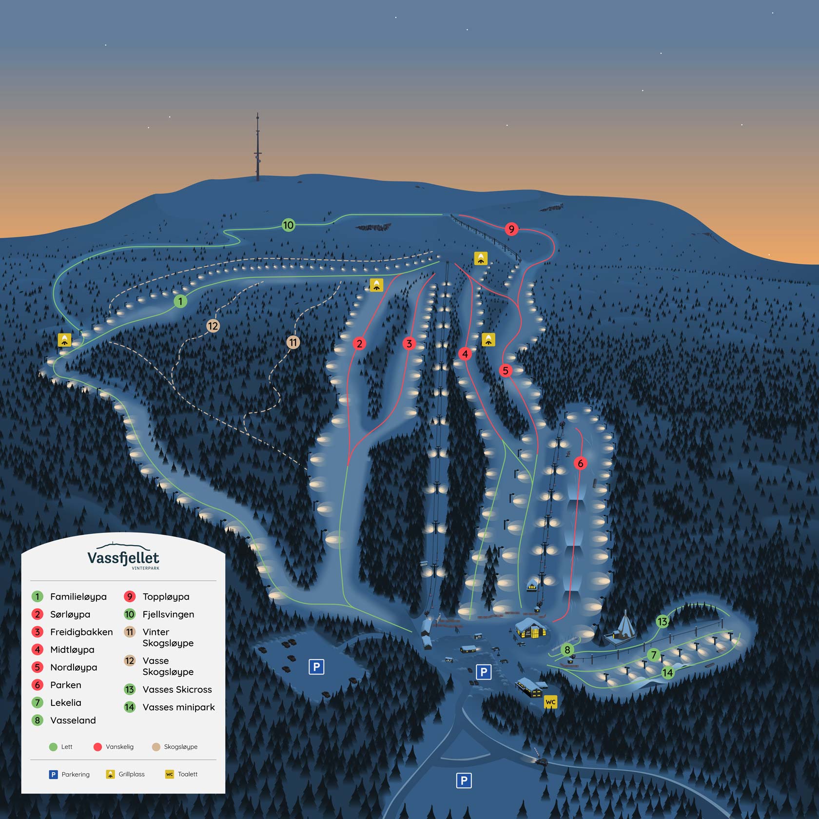 Vassfjellet vinterpark består i dag av tolv nedfarter tilpasset alle nivåer, med alt fra grønnløype til rødløype. Med det store antallet bakker er Vassfjellet et komplett anlegg for alle brukergrupper, særlig med det nyetablerte barneområdet med slakere helning på kun 3 %, samt en kraftig oppgradering av parkområdet. I tillegg legges det godt til rette for både frikjøring og organisert alpinidrett, hvilket har gitt nye rekorder besøkstall hver sesong siden etableringen.