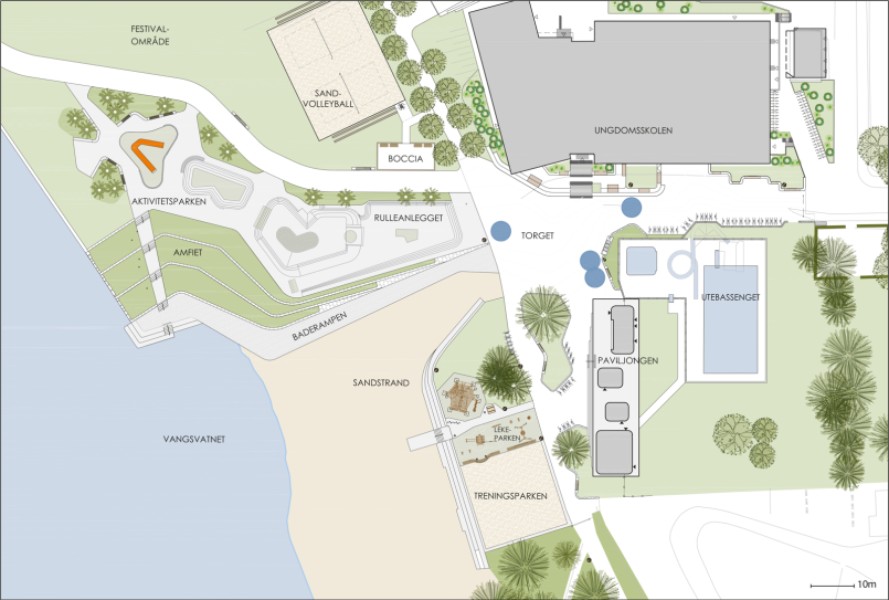 Parken, som ligg midt i Voss sentrum, er tilpassa alle aldrar og nivå, samt aktivitetsform og intensitet. Attpåtil er parken ei visuell perle, der ho skapar ei naturleg kopling mellom gras, betong og sandstrand, og høver perfekt til både kvardag og fest.