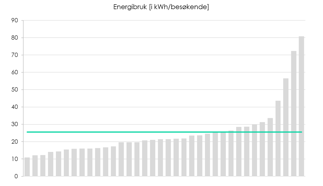 Figuren under viser energibruken i et utvalg av norske svømmehaller. De beste ligger på litt over 10 kWh/besøkende mens den som bruker mest ligger på 80 kWh/besøkende. Den store spredningen er et fenomen som er ikke observert i andre bygningskategorier, og kan spores tilbake til mange forskjellige løsninger og teknologier som er brukt i de forskjellige anleggene. Det er også vanskelig for alle parter i ett byggeprosjekt å tilegne seg kunnskap ettersom svømmeanlegg bygges i langt mindre grad enn for eksempel boliger og næringsbygg.