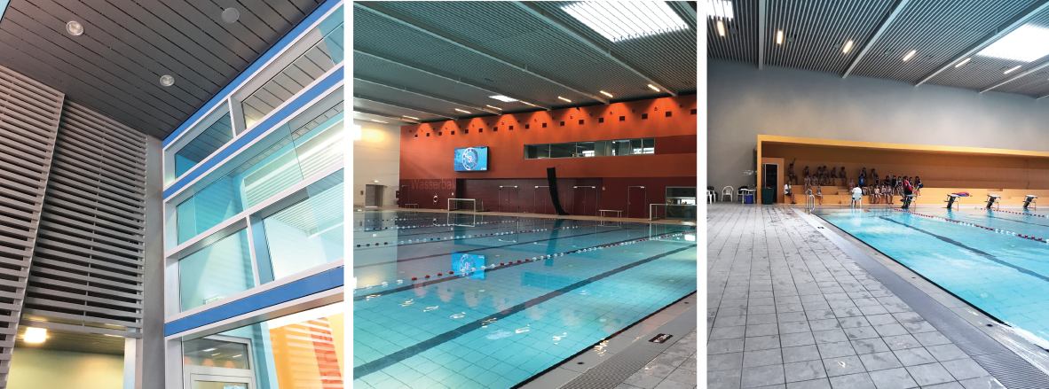Et flott svømmeanlegg med mye naturlig lys gjennom store vindusflater, gjennomgående fargetema og kreative løsninger for å bryte opp det ellers tradisjonelle anlegget. Som for eksempel tribunen som ligger som en oransje boks i rommet med en kapasitet på opp mot 200 tilskuere. Utformingen gjør at man sitter lunt med god sikt til bassenget uten å være på utstilling. Mens vi besøkte hallen var det skolesvømming, og tribuneområdet ble brukt som samlings- og undervisningssted.