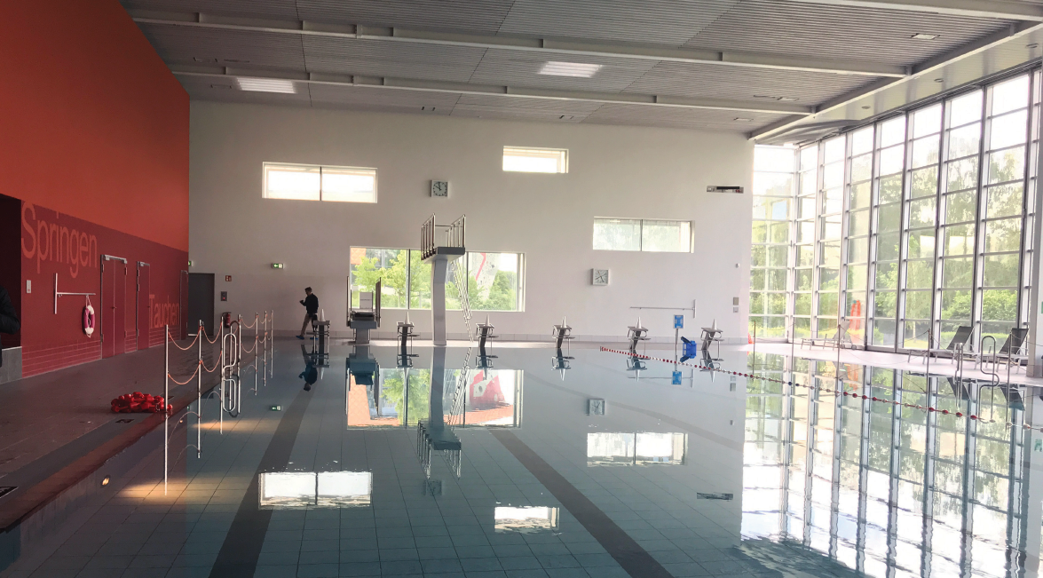 Ettersom vi ikke fikk gjennomført befaringen i Edeloptics.de Arena på grunn av det pågående valget, fikk vi anledning til å besøke svømmehallen som ligger i samme bygg, Schwimmhalle Inselpark. Svømmehallen åpnet i 2013 etter å ha blitt bygget på rekordtid (18 måneder) og kostet 19 millioner euro. Anlegget ble bygget med basseng etter internasjonale mål for vannsport, og brukes blant annet av Hamburgs vannpoloutøvere. Hallen består av: