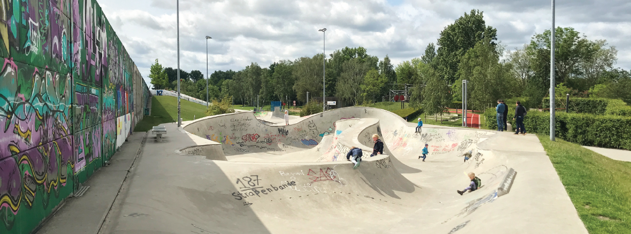 En stor skatebowl som under besøket ble brukt til lek og aktivitet av en besøkende barnehage med barn i alderen 3-4.år. Ingen skateboard, men allsidig brukt til løping, klatring, rusjing, hvilested, utforskning av egne ferdigheter og lek. Den lange grafittiveggen til venstre, blir hvert år dekorert på nytt av lokale grafittikunstnere under et felles arrangement.