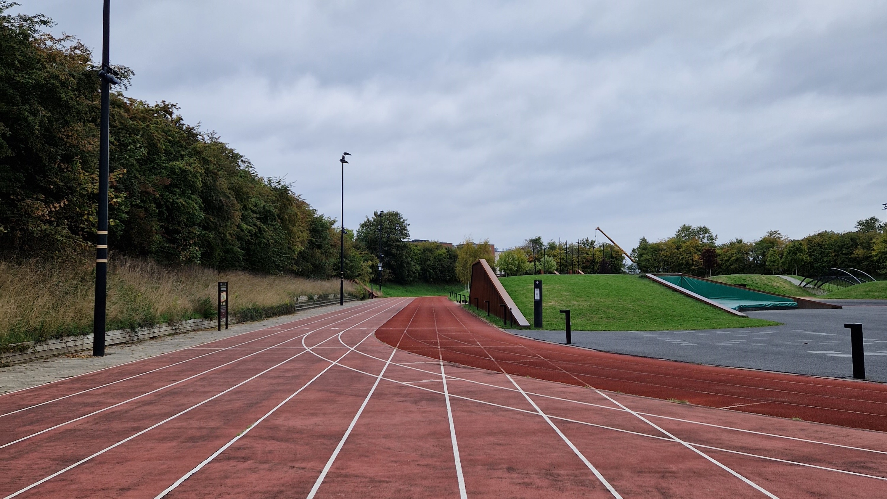 - 400 meter tradisjonell løpebane i syntetisk materiale. Seks baner strekker seg rundt hele banen, i tillegg er det anlagt to ekstra baner langs ene langsiden. De fire innerste banene er benytter seg av kunststoffdekke. De ytterste banene er bygget i betong, noe som gjør anlegget mer egnet for rullestolbrukere, syklister og rulleskøyter. Rundbanen er utstyrt med lyshare.