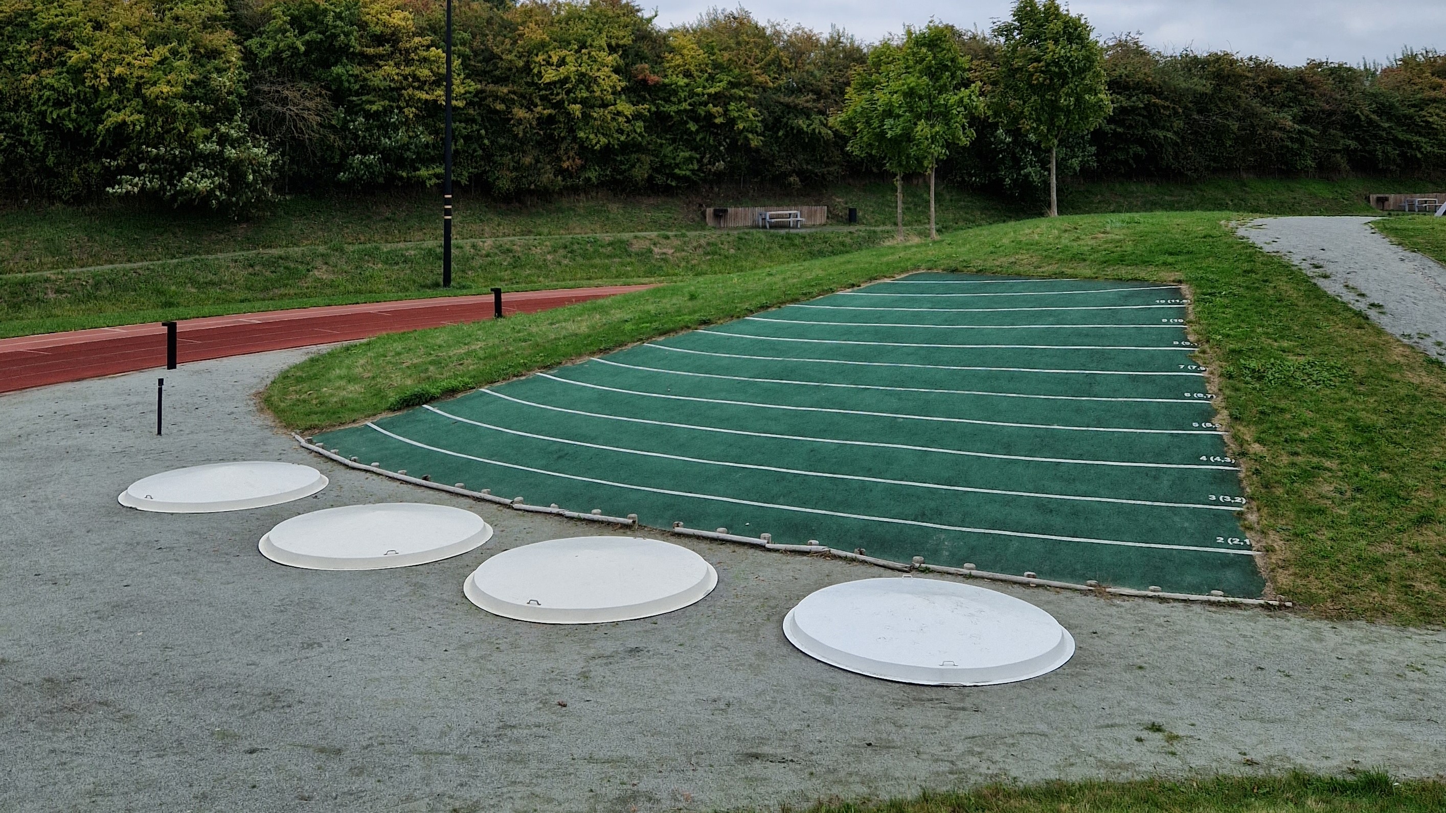 - Kulestøtanlegg: Anlegget har kun et anlegg for kastaktiviteter i form av sitt innovative kulestøtanlegg. Anlegget har fire kastringer for kulestøt, men i stedet for å kaste kulen ut mot en flate, for så å måtte gå og hente den igjen, har arkitektene også her tenkt innovativt: Her kastes det i motbakke. På denne måten triller kulen tilbake til kaster. Bakken er dekt med gummimateriele, og den nedre delen av bakken er forsterket med en trebjelke for å hindre at kulen triller ned på kasteren. Ved hjelp fra en ingeniør har man beregnet hvor langt et kast ville vært på flat bakke, basert på kulens bevegelsesbane i luften. De hvite stripene gir brukeren en indikasjon på hvor langt kastet ville vært på et ordinært kastanlegg.