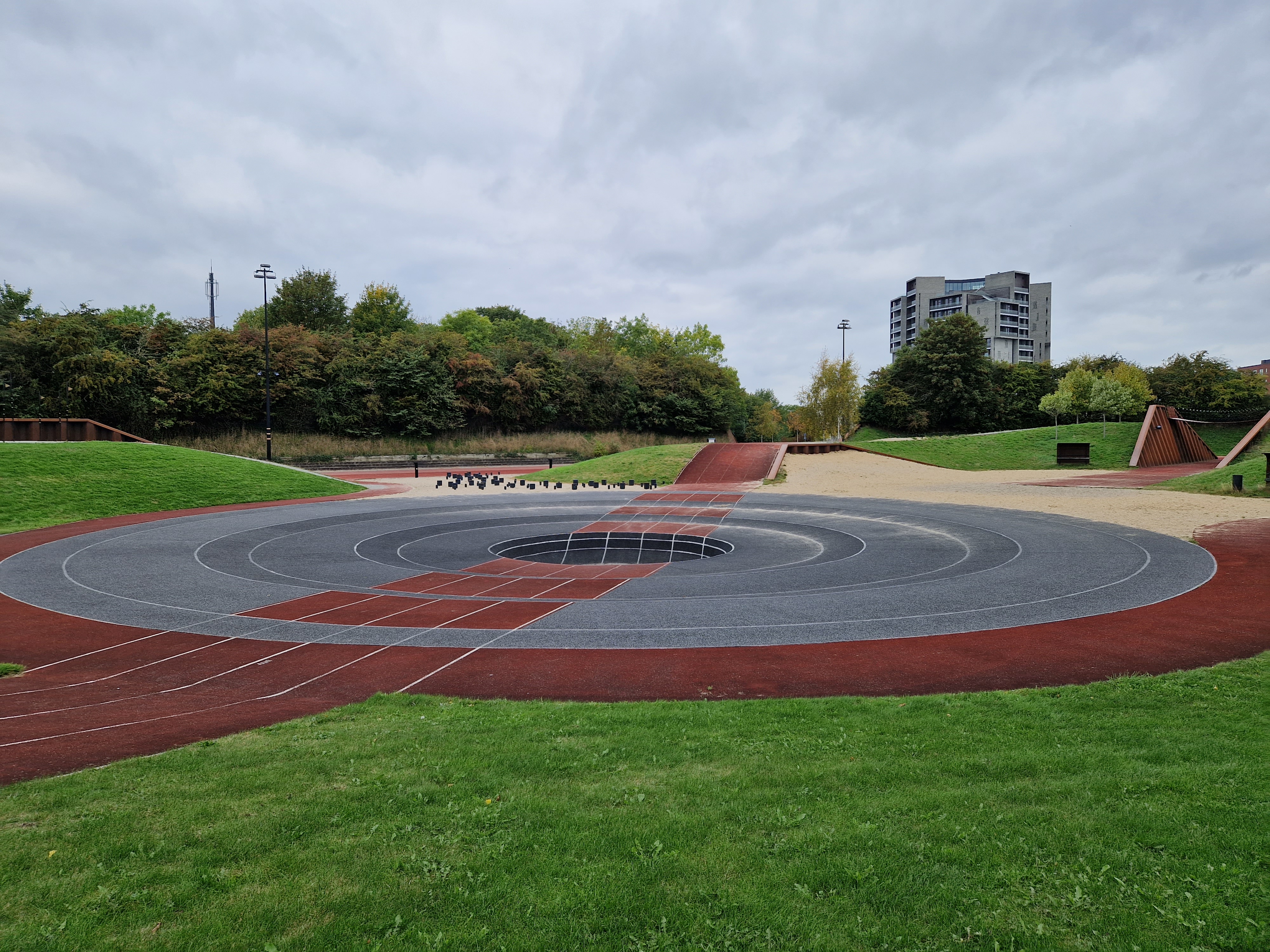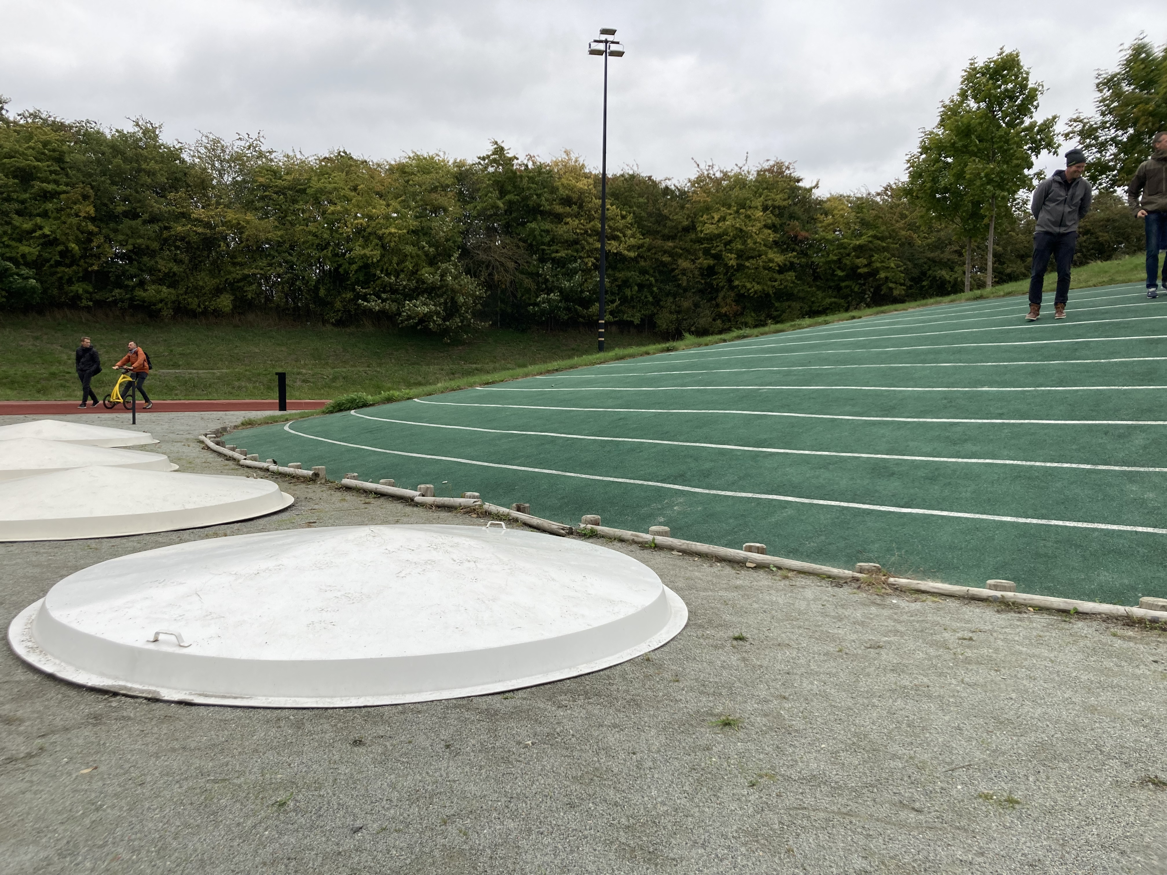 - Sosiale soner: Sosiale soner er en viktig del av anleggets utforming. På vollen ved den ene langssiden av rundbanen finner man flere samlingspunkt med benker og grill- og piknikarealer. På innsiden av kortsiden vendt mot universitet finner man også er samlingstelt, hvor det er mulig å holde seg tørr på våte dager.
