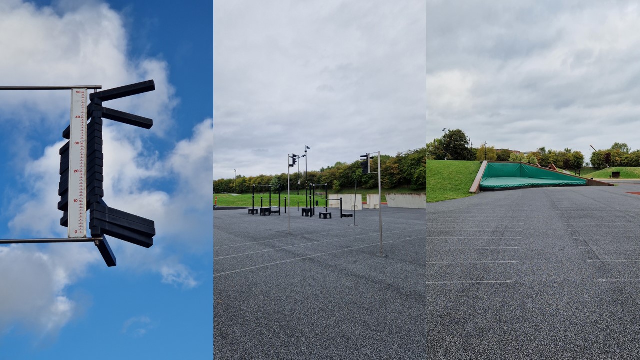 - Høydehopp/Hopp fra 2 meter: Høydehoppanlegg er bygget inn i en av anleggets voller. Fra vollen har man mulighet til å hoppe ned på hoppmatten fra ulike høyder, noe som gjør at anlegget blant annet blir benyttet til å øve på landing/fallteknikker i parkour.