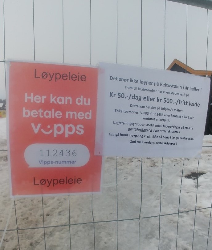 Bildet under er fra Beitostølen i 2018, der en må en betale for å benytte løypene frem til 10. desember. Dette kan anses som både rett og rimelig siden løypene i hovedsak består av snø fra snølagring, og snølagring er som kjent ikke gratis (se f.eks rapport om optimalisert snølogistikk i forbindelse med VM i Granåsen 2021). I vårt naboland Sverige er det vanlig praksis å betale for å gå i preparerte løyper hele sesongen, men at en noen plasser senker denne avgiften når natursnøen kommer.
