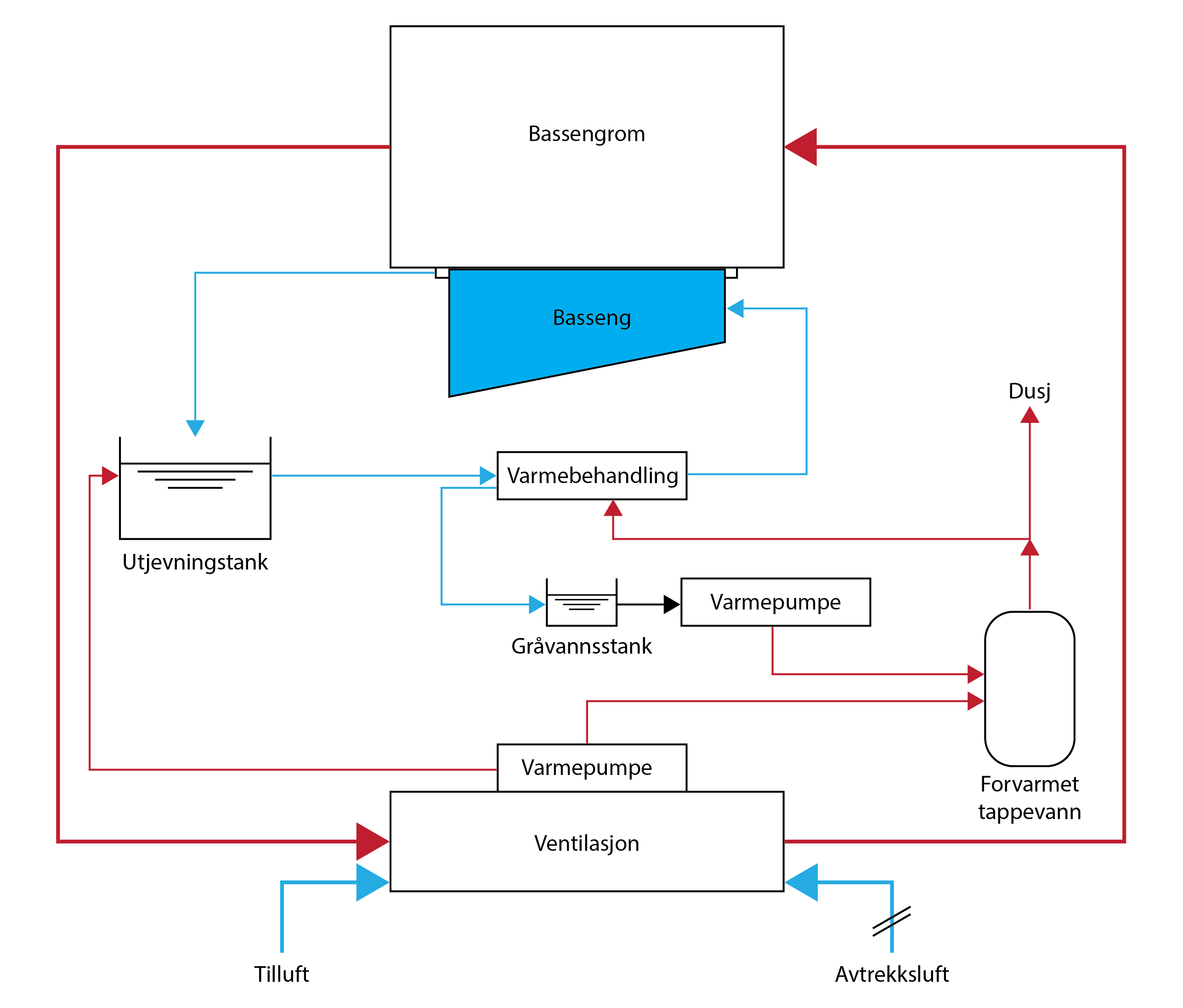 Et system som gjenvinner energien som er lagret i vannet og lufta er avgjørende. Spesielt i sommermånedene kan det være et energioverskudd i svømmehallen og energien man gjenvinner med hjelp av ventilasjonssystemet må fordeles til luft, bassengvann (kompensere for fordampningen) og tappevannet. Teknologien som er brukt er kryssvarmeveksler og varmepumpe. En gråvannsvarmepumpe som gjenvinner energien fra dusj- og filtervann er en lønnsom investering når anlegget er stort nok.