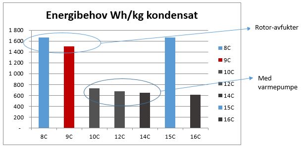 Som det fremgår av figuren under er driftskostnaden på de disse to teknologiene forskjellig, der den viser energibehovet per kg kondensat. Med en avfukterteknologi basert på varmepumpe vil den ha dårligere driftsøkonomi jo lavere settpunkt på temperatur man har i ishallen, derfor er det ideelle inneklimaets settpunkt rundt 12 °C og 55 % RF. Ventilasjonen bør gjøres med ventilasjonsanlegg med adiabatisk kjøling (En adiabatisk prosess er en prosess uten energiutveksling med omgivelsene, det motsatte av diabatisk (Store norske leksikon)) og høygradig varmegjenvinning for redusert kjølebehov.