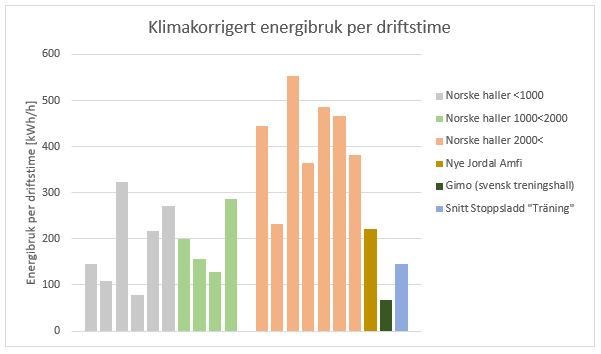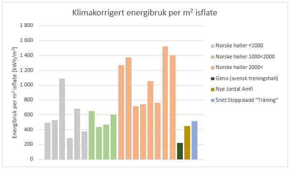 Gimo ishall, en svensk treningshall, viser seg å være en særlig energieffektiv ishall, noe som er illustrert i figurene. Også nye Jordal Amfi vil ifølge beregningene være klart mest energieffektiv i sin klasse (ishaller med stor publikumskapasitet).