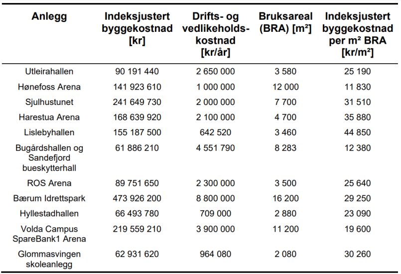 Indeksjustert byggekostnad varierer mellom 11 830 kr/m² til 44 850 kr/m². Selv om anleggene er rimelig tilsvarende hva gjelder fasiliteter og bruksområde, varierer altså byggekostnaden voldsomt.