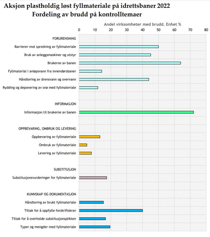 Miljødirektørene gjennomførte i 2022 en tilsynsaksjon ved 170 kunstgressbaner, eid av 88 ulike eiere. Tilsynet avdekket brudd på forurensningforskriftens krav hos 72 av de 88 kunstgresseierne.
