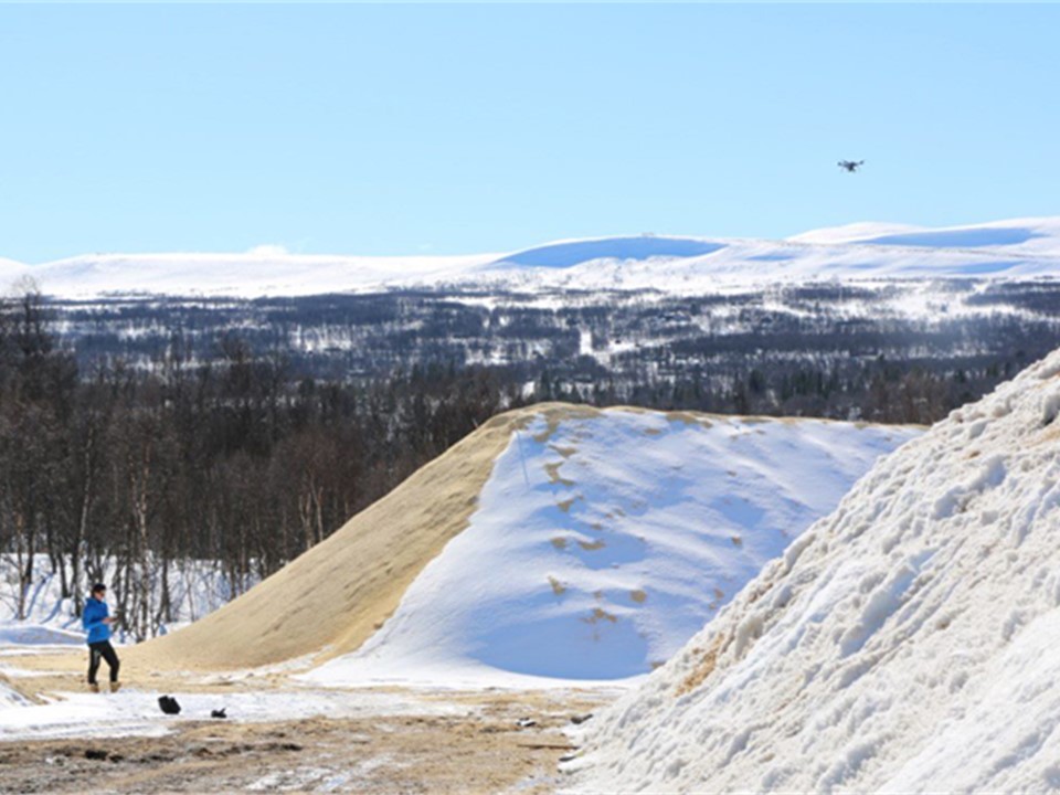 Snølagring ved bruk av treflis for å isolere snøen. Foto: Sondre Bergtun Auganæs ved Senter for idrettsanlegg og teknologi.Måling av snølager med drone
