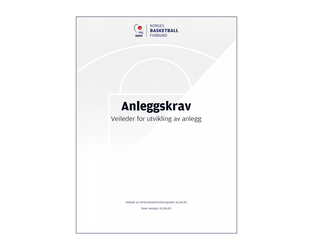 Dokumentet "Anleggskrav - Veileder for utvikling av anlegg" er Norges Basketballforbunds kravdokument for anlegg for basket, fra 2020. Anleggskravene er delt opp i to nivåer, nivå 1 som dekker elitebasket og nivå 2 som dekker ordinær basketaktivitet (kamp og trening).