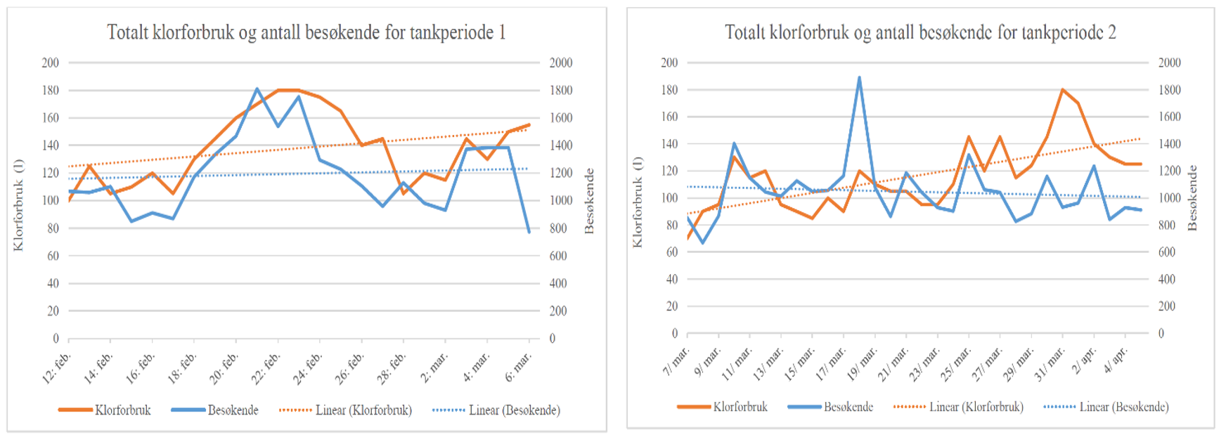 Temperaturen på lagringsrommet i anlegg 1 ble målt til 23 °C. Dette er langt høyere enn anbefalt i sikkerhetsdatabladet til NaOCl hvor det står at klormiddelet bør oppbevares ved 5 °C. Resultatene viste at klorforbruket var avhengig av antall besøkende, men at trenden for klorforbruket økte gjennom periodene selv om trenden for besøkstallet var relativt konstant, se figur. Dette tyder på at degradering av NaOCl har funnet sted og at andelen tilgjengelig klor er redusert. Tilsvarende degradering er ikke forventet med bruk av elektrolyse ettersom lagringstiden er langt kortere.