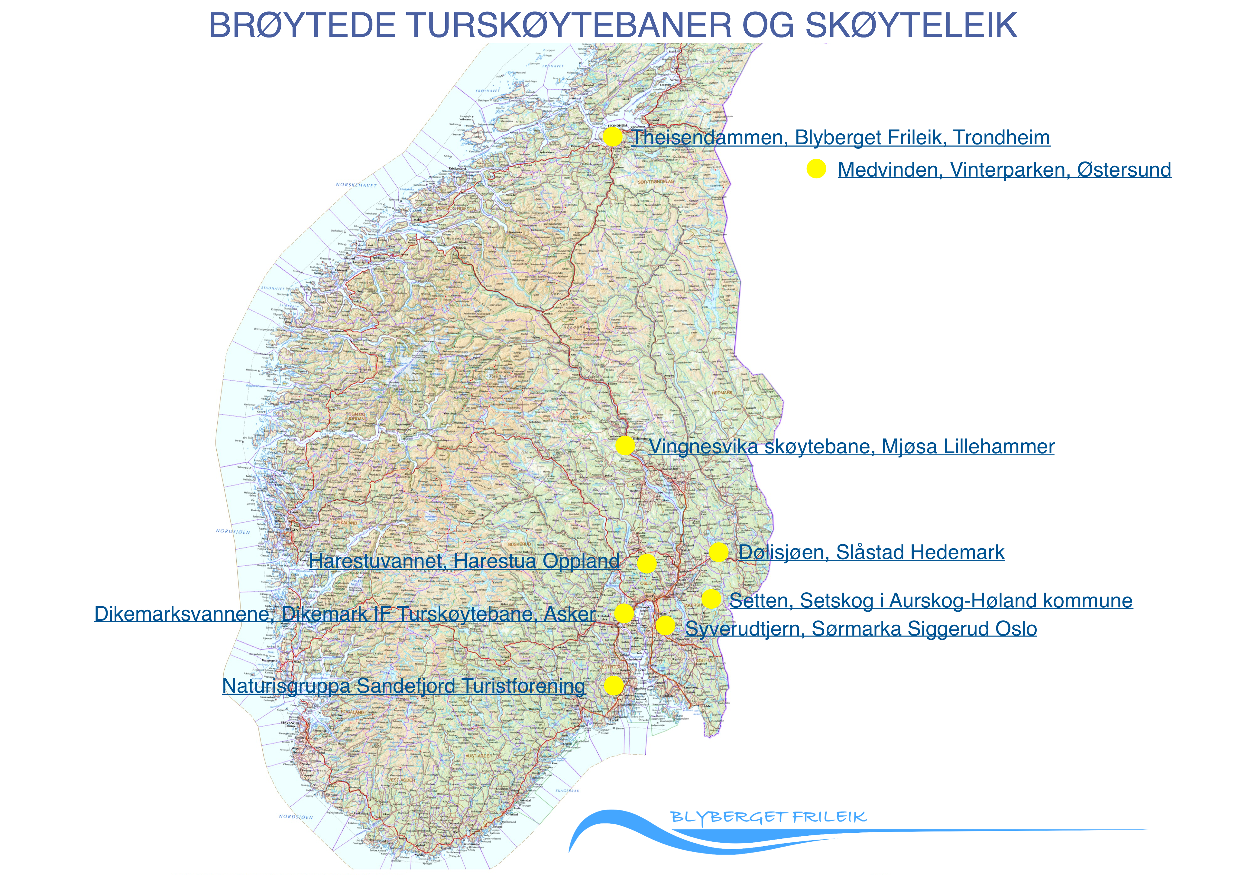 Kartet nedenfor viser lokaliseringen av de preparerte skøytebanene på islagte vann i Norge.