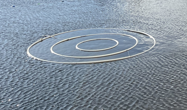 Deretter festes ringene til hverandre med plastbånd, som en kan se på bildet under. Det gjør at konstruksjonen blir stivet av, samt at ringene forblir på sine respektive plasser med gitte avstander. Den stivere konstruksjonen gjør det også langt enklere å legge ringen ut på vannet, samt dytte den langs vannflata.